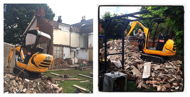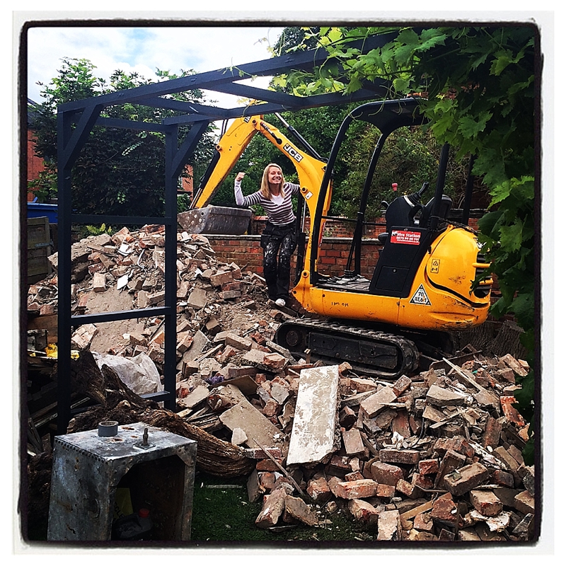 Proper building sites need proper toys and thanks to Hire Station over in Trafford Park we’ve had some big hitters at Moregeous Mansions to wreak havoc in what was once my garden / home / world. In just two weeks we’ve gone from a slightly battered but relatively normal home to a rubble filled tip to what is now a clay thick mud bath. There isn’t a #BuilderCat in hell’s chance we’d have achieved all that as quickly without hiring the mini-digger and breaker, I am SO glad we did. Instead of having to dig and wheelbarrow all the bricks, mortar, plaster, concrete and earth, everything’s been shovelled up and dumped near the gates for a huge grabber to come and take away. Full credit to Mr M and the lads nonetheless because there’s still been a huge amount of heavy duty clearance required by non-machines, ie. them. Though having watched him shift rubble this week, I’m starting to think Mr M might actually be a machine. My very own Terminator.