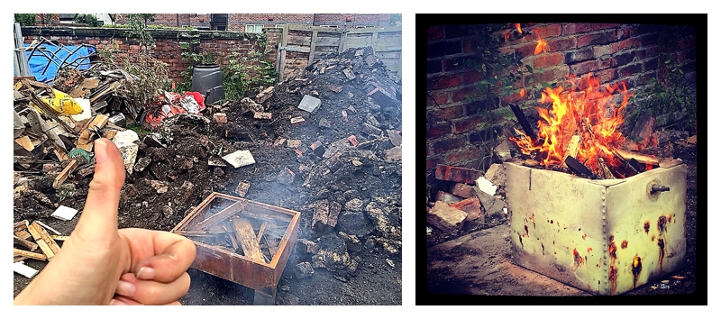 And as the boys dug, the piles of debris got higher. My Bank Holiday Monday was filled with chopping up and burning endless unsalvageable pieces of timber filled with nails or covered in paint. The old metal water tank which fell out of the demolished roof space came in very handy indeed as a fire barrel, changing colour beautifully with the heat and blowing flame feeding oxygen through holes at it’s base into the heart of the furnace – perfect! I do quite like this battered old piece of metal actually, might just have to find a reclaimed spot in my new garden for it…