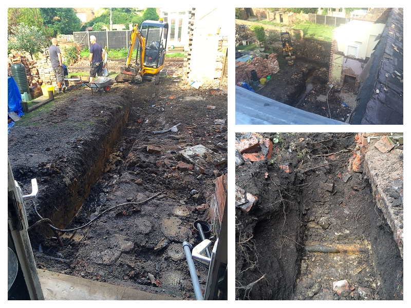 Could it have rained just a bit more for them, for heavens sake, in August?! Honestly, the place was a claggy mud bath as our ground is pure clay, great for forming solid trenches which don’t need shuttering, but boy is it thick, heavy and tough to dig.You can see how yellow is it, stickily grabbing every centimetre of our boots. I think we’ve mopped up inside about 76 times since Friday.