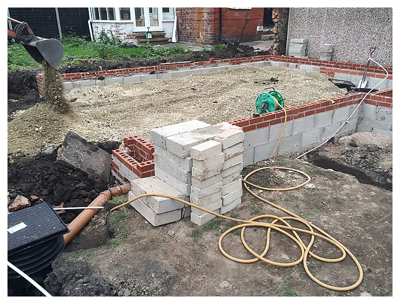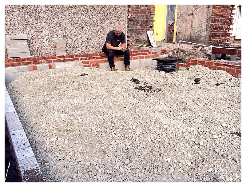 Feels like massive progress as we see the MOT stone going down on top of the reduced depth earth oversite within the garage walls. I always find the building process endlessly fascinating and being part of it all unfolding at Moregeous HQ is ace! Missy Builder Cat clearly feels the same way, clamped to my legs all day.