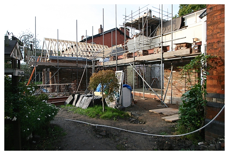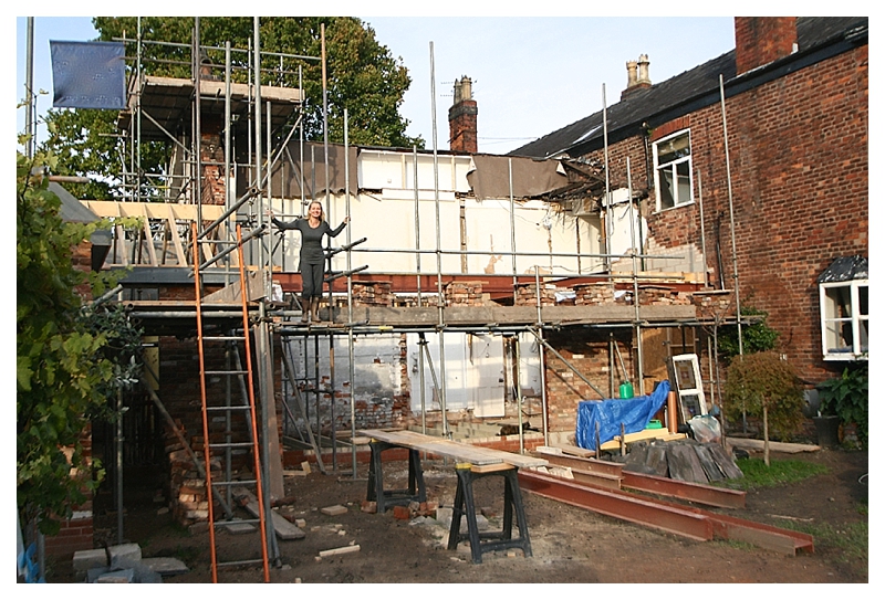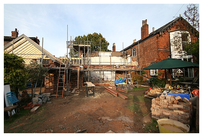 So me, Missy & Mr M are about half way through the build process at our home Moregeous Mansions, a period Manchester property near the city which was in a whole heap of crumbling trouble but which we’re restoring and rebuilding back to it’s former glory. The collapsing oldest part of the house, which was a stables in the golden olden days)was taken down brick by brick and in it’s place is being built a new extension housing a spectacular kitchen and utility on the ground floor, then two beds and a bathroom on the first floor. Missy’s just taking a break from official Site Gaffer duties above and looking over her shoulder towards the her new domain. For the first time this weekend, as I quietly explored when no-one was there, it felt like a house was coming together rather than simply a building site. Below is the view as you come round the front of the main house into the garden, where the neighbouring student house once looked straight in, it’s now almost hidden.