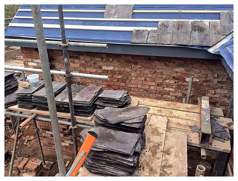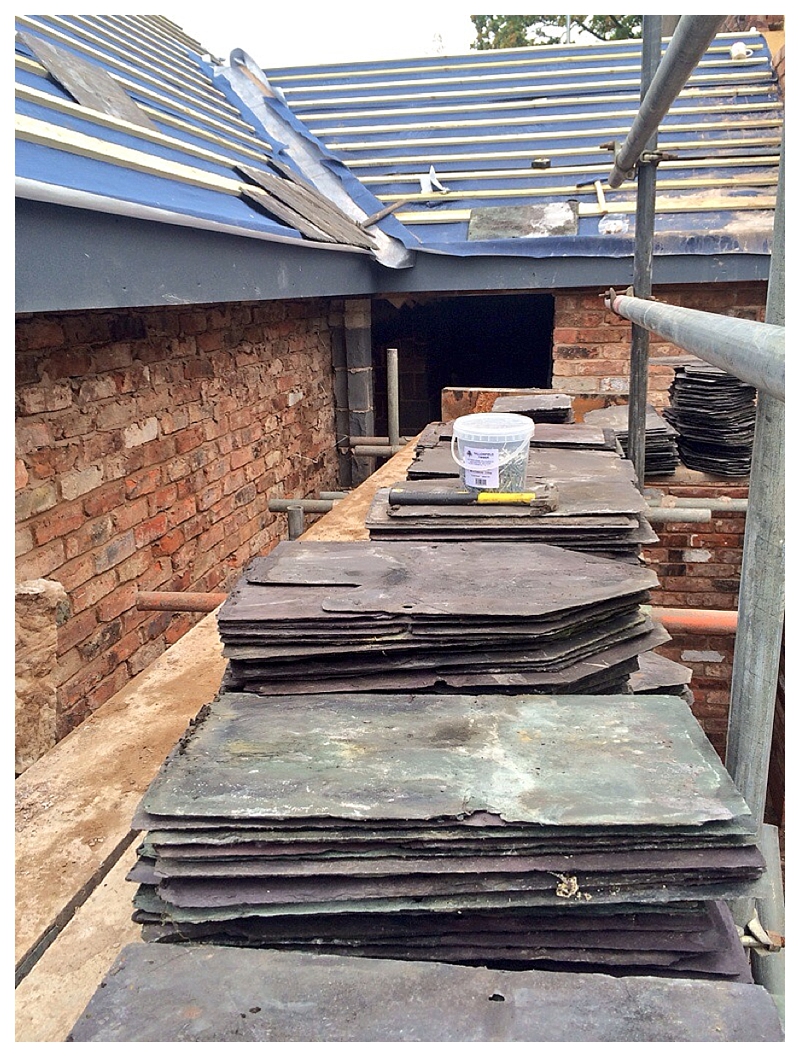 So we’ve got to the stage when lots and lots more 20 inch by 10 inch slates are required asap. I should really have addressed this sooner and already had the tiles here on site but recent events knocked all the schedule out! When the original West Wing was dismantled, approximately 500 original slates were carefully removed and stacked ready to be re-used, however the larger replacement extension, newly built workshop and utility means we need about 1800 more. This means sourcing ones which match in size, colour, style and thickness. No mean feat.