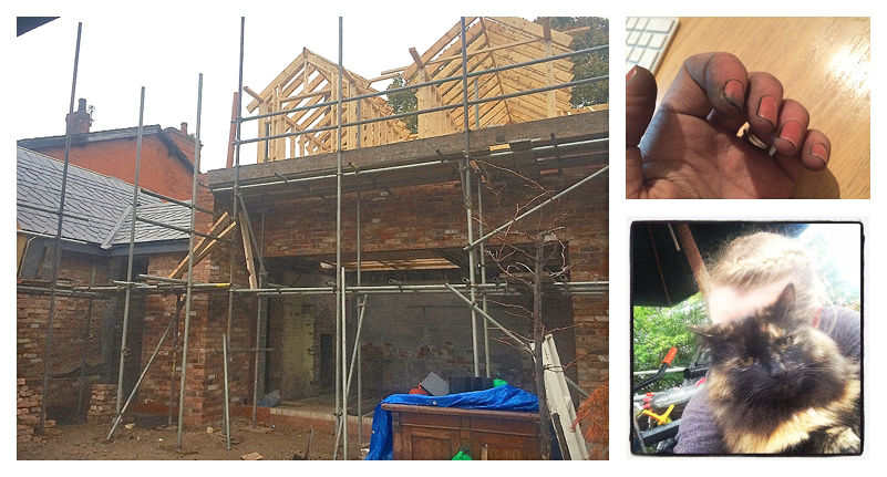 Today started off so well! Bright sunshine, blue skies and though it’s all turned to mud again, so much has been done in this last week or so I wouldn’t dare complain. Check out my panoramic!! For the first time looking at it from under a rain splashed umbrella, it all looks joined up and you get a sense of what it’ll look like when complete. The fishtail slating is almost complete on both the garage roof and little utility which joins it to the main kitchen. The scaffolders came today to raise up the scaffolding from a bricklayers lift to a roofers one, as joinery work carries on to build the dormers (all three of them!). I swear we will be single handedly ensuring profits at Fallowfield Timber this autumn with the amount of wood being used, but don’t they look fab already. Can’t quite believe it’s my house really, after so many years of living with a falling down, unusable West Wing. It’s WICKED!! A bit like my nails….