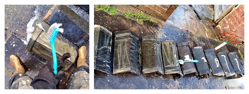 We were very conscientious today, Karcher-ing them down thoroughly and giving them a good rub & scrub with Cif to get all the green slime and pigeon muck off. No poo on my new roof thank you very much.