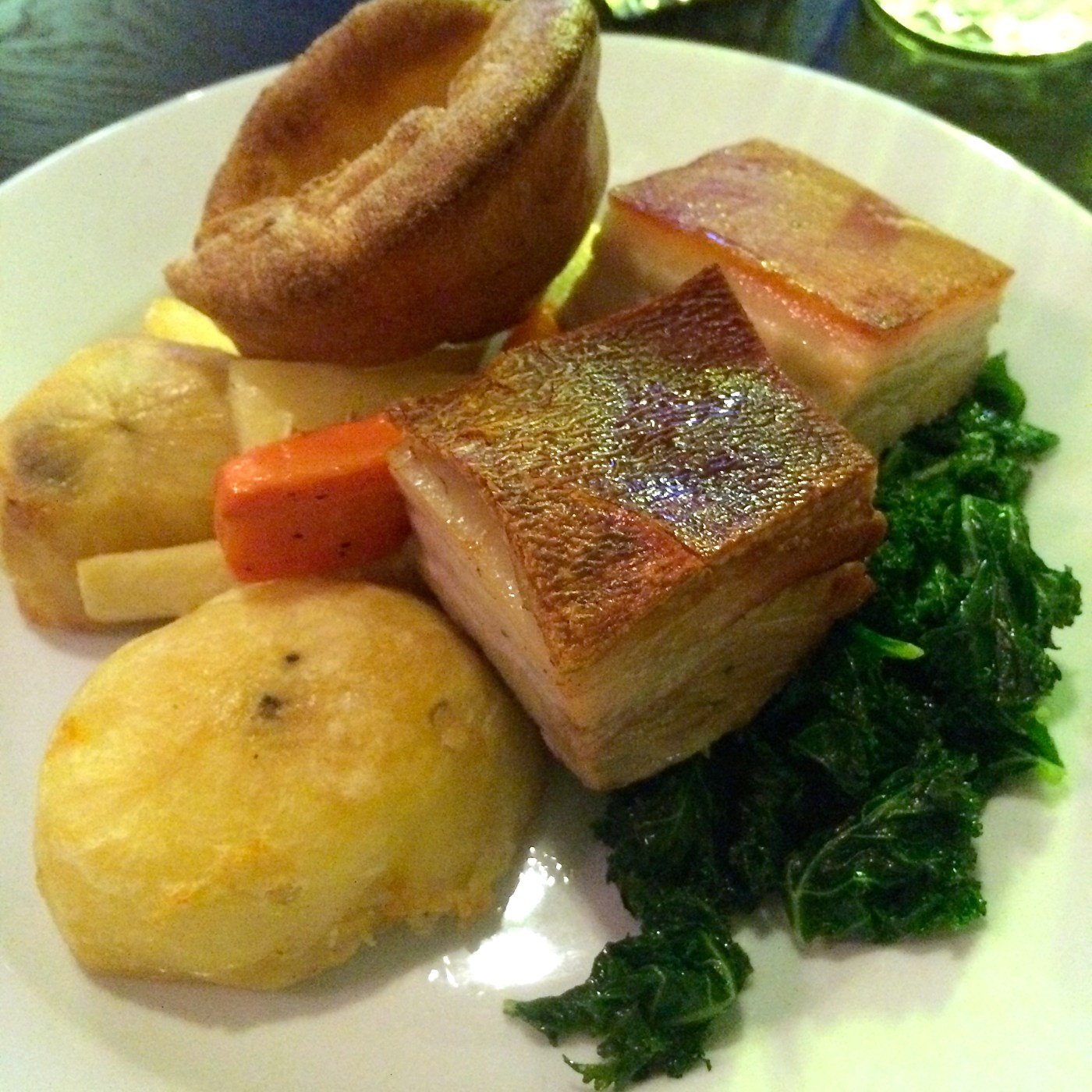 Mr M fancied the steak pie and our guests ribs and Caesar salad, so I was the only one on a roast run. Having had Old Sessions beef and Met chicken in recent weeks, I was ready for some pig and I was HUNGRY, at £9.95 it seemed very good value locally. I’m a bit gutted to tell you I was disappointed 😦 Instead of slices of succulent pork, there were two cubes of belly pork which looked a bit odd, like cake. I know it’s good to be different and try new things but I couldn’t be faffed with cutting through the layers of fat to get to the very small amount of pork in evidence. The roast potatoes were good, the gravy thick and scrummy but not much veg and the kale was stringy and a bit tough. The girl on the next table was having the chicken and hers looked great, I think i just made a bad choice as this new place finds its feet and tries out what works and what doesn’t. I’d rather have paid more and got more.