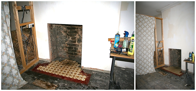 As you can see below on the left hand image, the fireplace couldn’t even be seen until a few months ago, it was totally hidden with by plaster, skirting board and carpet. When we removed the old plaster from the walls, there was the original hole in the wall which was then boarded around. As we cleaned the room this weekend, I realised, like an over excited magpie, that under the grime and blackness around the fireplace was a little bit of gold.