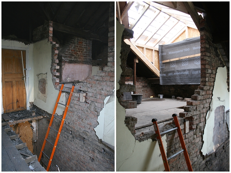 Finally! After four months of non-stop work to the new extension section of Moregeous Mansions, we’re finally breaking through and connecting what has felt like two separate buildings for so very long. We never properly used ‘the West Wing’, in Georgian then Victorian then Edwardian times it was a stables and servants quarters no less but after years of neglect by previous owners had become damp, unsafe and had subsidence. It was full of poky little rooms used only for storage and general dumping but now it really feels part of the house and it’s time to connect it back to the main section and open up the linking corridors.