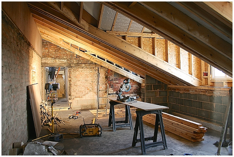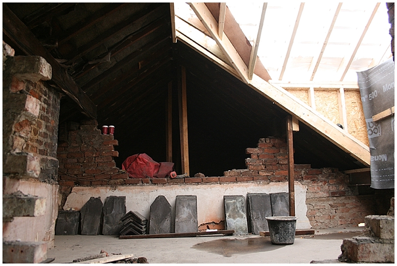 This view above is on the first floor looking back to the connecting corridor. The old ceiling and entrance need to be made higher to allow for the changed levels of the new build and that’s what’s happening today. It’s nigh on impossible to do this with drawings as you don’t know what you’ll find til you open up so it’s a case of rip it out and work with what we’ve got.