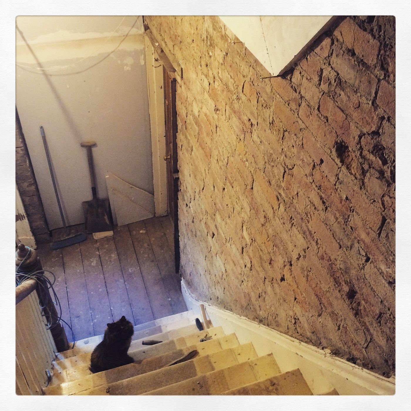 We’re well underway creating the bare brick feature walls in the hallway and landings at Moregeous Mansions and it’s been a very dusty, dirty couple of weeks. Not only did we need to remove three floors of old, crumbling plaster and hoist that into the skip, but I made the slightly deranged decision to save the original wallpaper from the front of the plaster! It wasn’t easy but we managed it, leaving us with several sheets of fab soon-to-be-artwork to decorate the new walls.