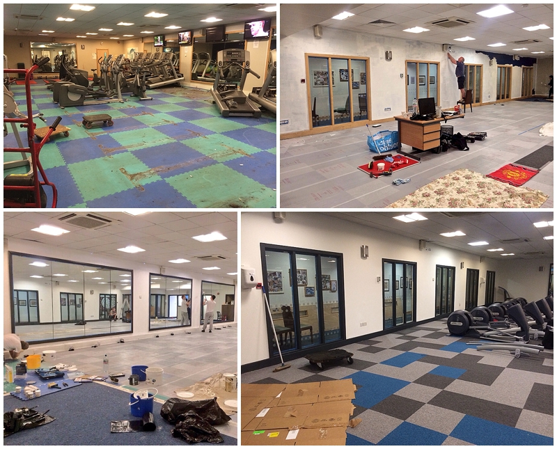 Specifying the new flooring was something new for me, I’d never designed a gym space before! I knew I didn’t want a boring chess board pattern using just two colours and had seen some interesting computer generated images of carpet tiles in a much more random pattern. God love the fitters who turned up expecting to throw the charcoal and silver tiles down in a couple of hours.