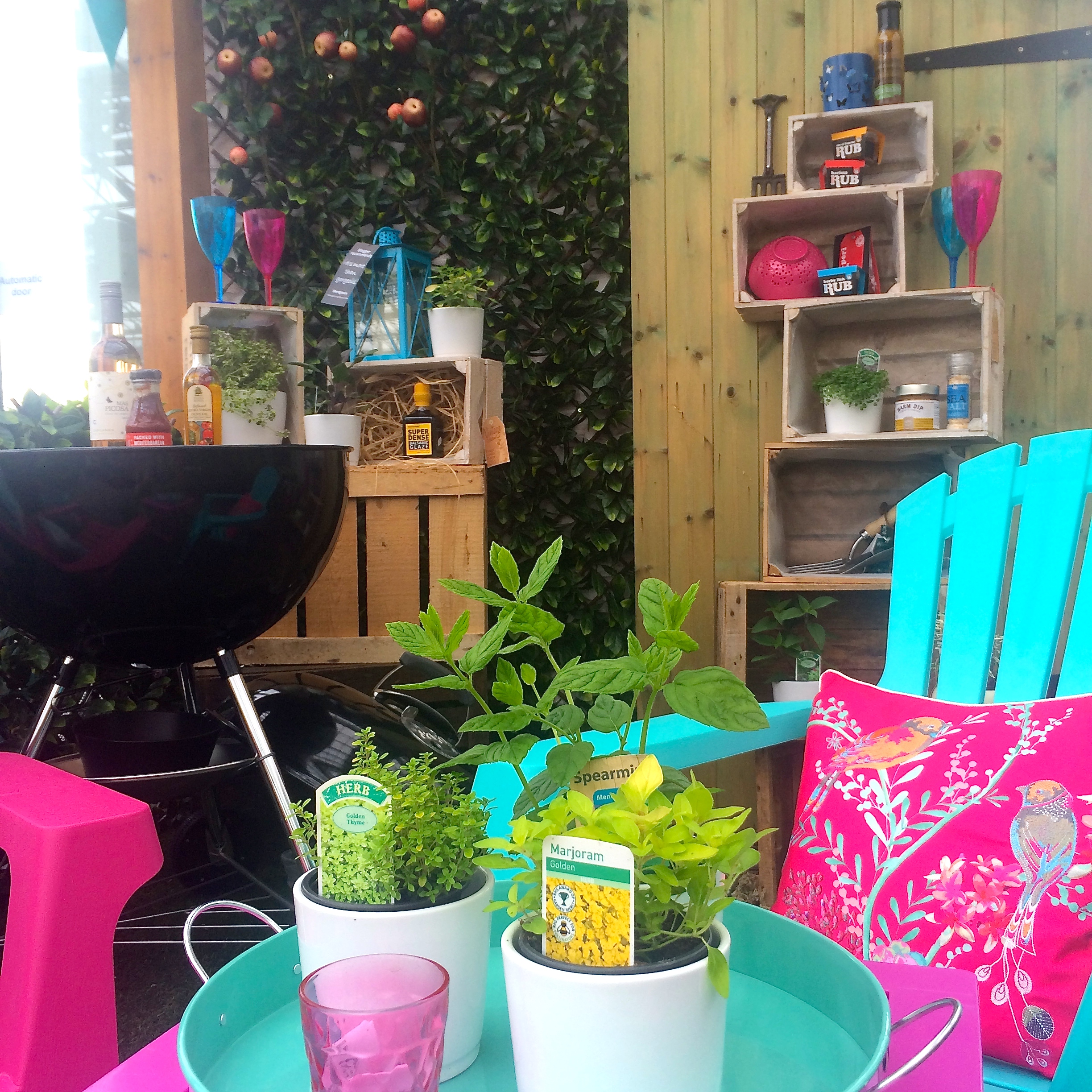 Bents asked me to update an area in Open Skies as part of my morning challenge last week – a speedy whizz around the store to create three brand new, on-trend spaces using all their products and plants. Using bright fuchsia pink and an eye popping turquoise, we transformed a tired vegetable patch into a ‘Herby Entertaining Space’ in just under an hour! Colourful chairs, throws, cushions and accessories made the small area feel ready for a summer barbecue, and the pots & planters of herbs brought it to life. The stylish bunting was very poplar with visitors, as were the planters of ready picked herb mixes. It’s all very well building ‘outside’ room but for me, if there’s no greenery, you may as well be indoors.