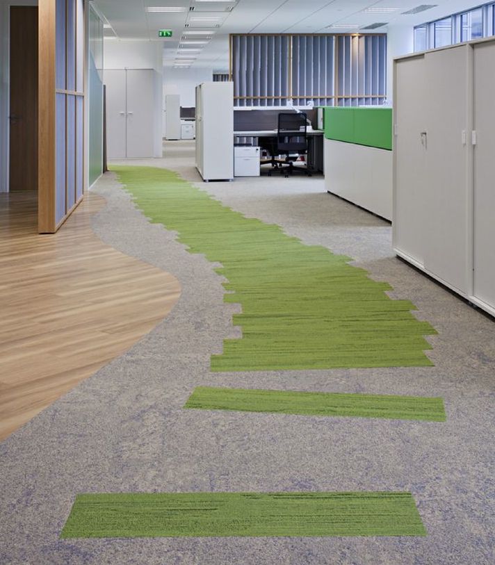 Carpet tiles haven’t been thought of as particularly innovative for a very long time but that’s changing on a commercial level. For the gym flooring I recently designed at Withington Baths, I used an Interface blue tile in amongst the greys to zone where the pathway around the equipment would be. Some of their recent designs incorporate the zoning trend brilliantly and this is very easy to do in office spaces, inexpensive and very effective.