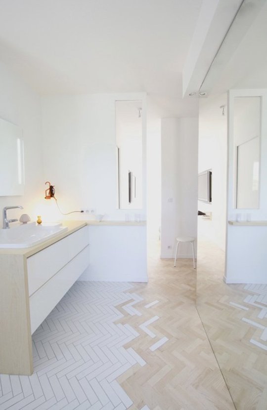 The parquet floor has been created using parquet pieces of the same size to create a melting into each other effect, but unusually the white sections are tile and the timber section are, well, timber. This creates a more practical tiled zone in the wet area and a wooden walkway through from the hall. Very clever. Very expensive as well, I suspect 😉