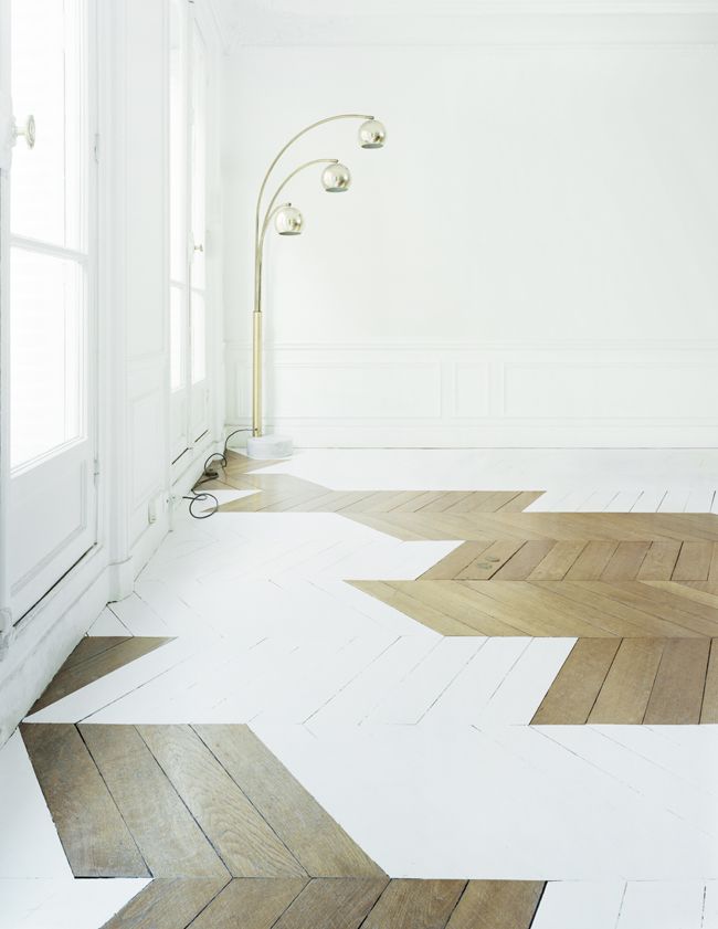 Forming a walkway or demarcating different areas in a large room using timber and paint works brilliantly, as long as you have a steady hand and plan well. The floor above has been specially laid in different sized planks which run in different directions, this takes some planning but does look very cool.