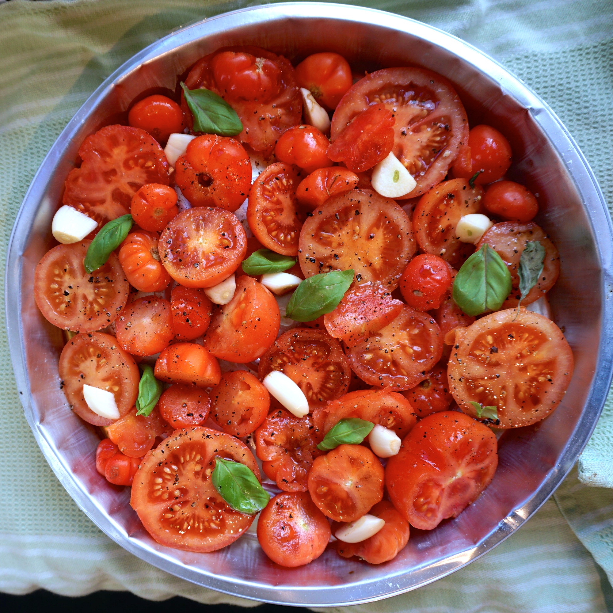 Boy, was I looking forward to my tea tonight. Fresh homegrown tomatoes from our vine, still juicy in November and picked last night. Seasoned, drizzled with oil, balsamic & basil leaves, garlic cloves tucked into gaps and popped in the oven at 10am for 2hrs slow roasting to release their sweet flavours ready to accompany a chunk of rump steak. That was the plan. That was the plan until I got busy and tried to juggle too many jobs whilst getting ready for filming with Magnet Kitchens this afternoon and forgot to turn the oven off before I left the house…..