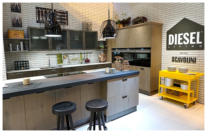 Let me tell you, there’s a whole lot of hot for 2016. Some years are a bit meh but not this one. I adored the tactile, warm and very versatile styles on show, plus the clear movement towards individuality generally. I’m going to write up a full low down tonight (whittling down from 335 gorgeous images!) but just want to show you one of my favourite collaborations from KBB16, that of Italian design company Scavolini and fashion retailer Diesel. Seriously how cool is this space?