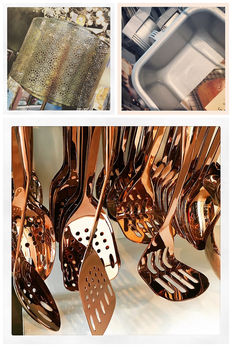 Cool light in BHS, very Moroccan with it’s laser cut brass detailing. I then totally fell for the lustrous new silver bakeware in M&S, it would almost be a shame to cover it in cake-mix and as for dipping those copper utensils in a spag bol – never! #justforshow