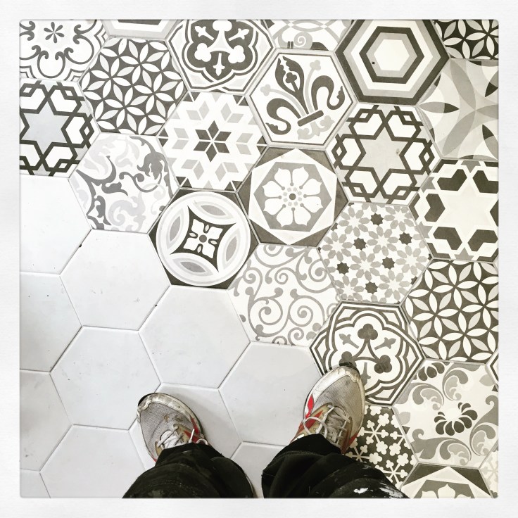 Boring floors begone, it’s time for some fun. Zoning tiled floors works brilliantly for introducing pattern in smaller areas, especially bathrooms, hallways or kitchens. This one I’m working on below isn’t quite finished but it’s looking ace (if a little mucky) so far!
