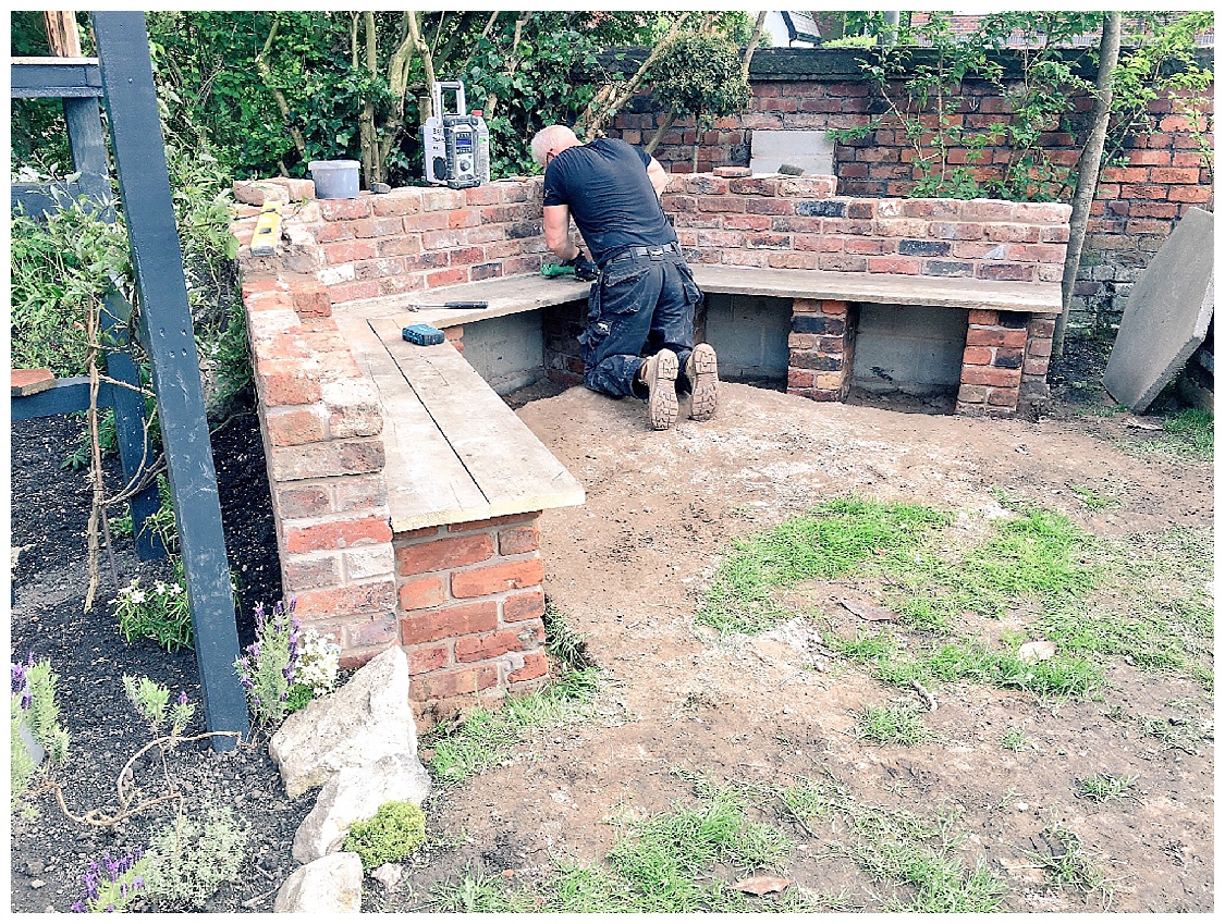 Whilst I was down at Clerkenwell Design Week, Mr M & Brickie Brian built up the pillars to take the seating lengths, using more beautiful reclaimed bricks for strength. We debated brackets or timber vertical struts but decided on something more sturdy and reliable, quite possibly having in mind the dancing on the seating which will inevitably take place.