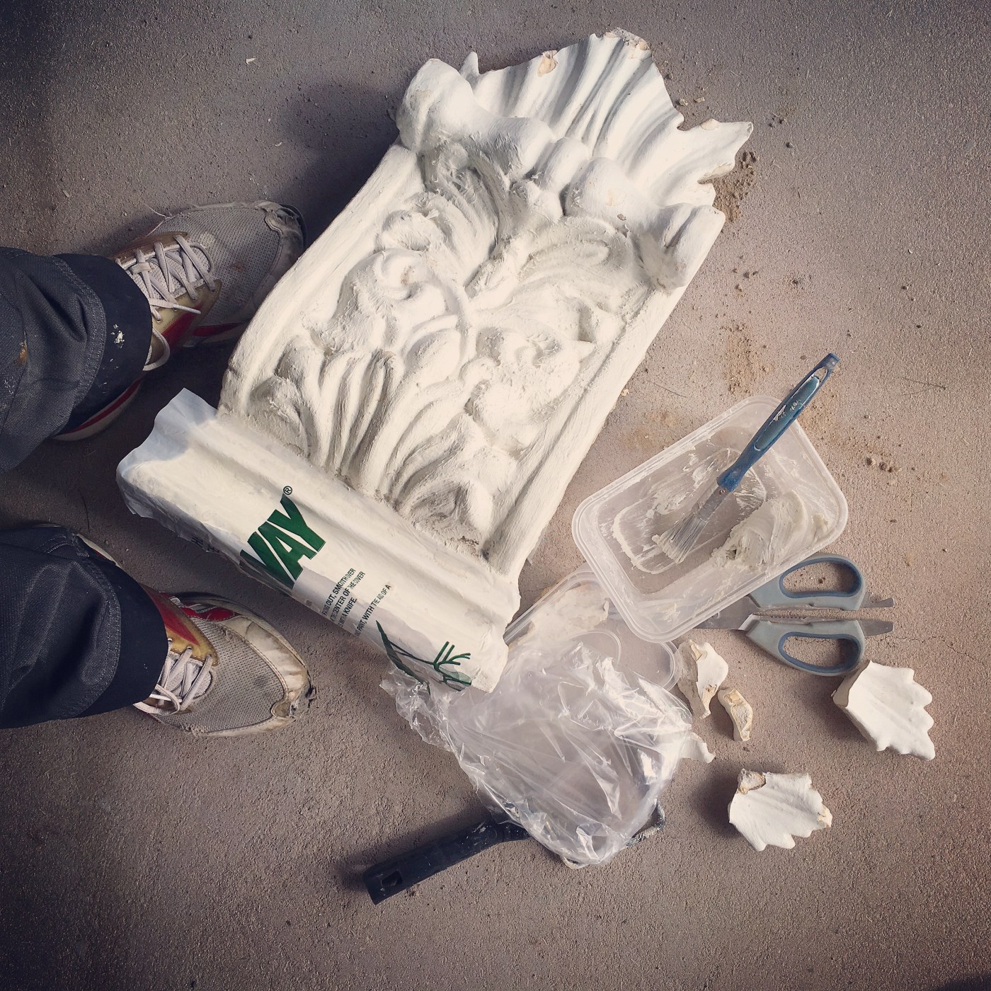 Whilst we were taking apart Moregeous Mansions ready to be rebuilt again, one of the hallway corbels, a gorgeous original plaster wall feature, had literally dropped off the wall with a giant crash. I was quite traumatised at the time, as were the within-earshot builders by my rather choice language. Luckily an intact one remains on the wall so Leo the plaster artisan can cast and fix fresh leaves to the bottom of the broken one, but regardless of leaf loss, the old paint had to come off both.