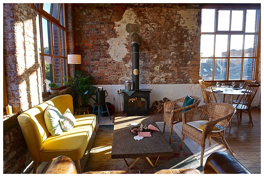 The deep blue entrance hall, suspended gilt lettering and kokedama moss balls hollers contemporary decor but a step through into the cavernous restaurant space whisks you back to Lancashire’s industrial past.