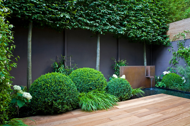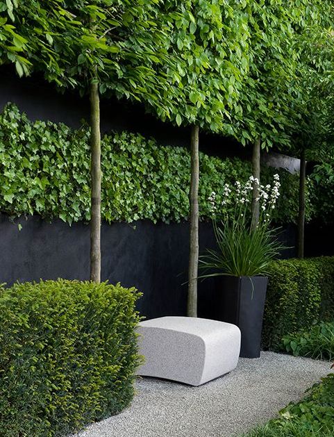 Where tall walls of privacy are needed, but brick or timber would be overbearing and much too stark, you can easily see that pleached trees are the ideal solution. Imagine the garden above without the trees. It’d be rather an overpowering wooden screen, with no softness at all.
