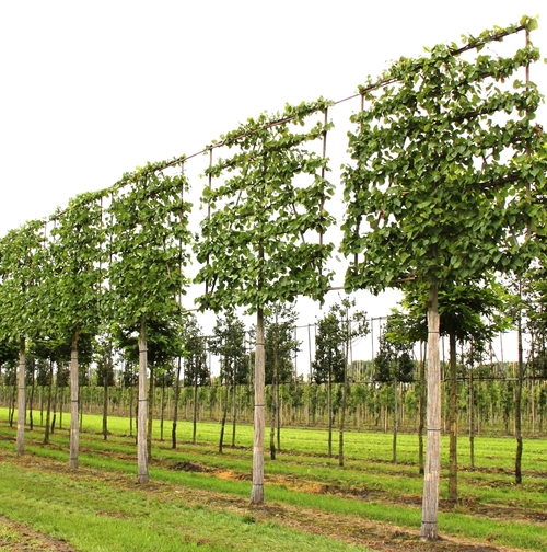 Pleaching is an old arboreal technique of creating, effectively, a “hedge on stilts”. The trees used are usually limes (Tilia), particularly Tilia platyphyllos ‘Rubra’, Tilia x europaea ‘Pallida’ or Photinia Red Robin, but Hornbeam (Carpinus betulus) is also popular as it can retain brown leaf cover over winter, ensuring privacy most of the year round. If year round screening is essential then the evergreen Holm Oak (Quercus ilex) is often chosen.