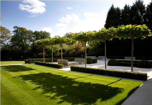 Below is an unusual example of how the style is used on the Wentworth Estate. Instead of using flat vertical forms, the Plane trees are trained almost as greenery umbrellas. Too cool.