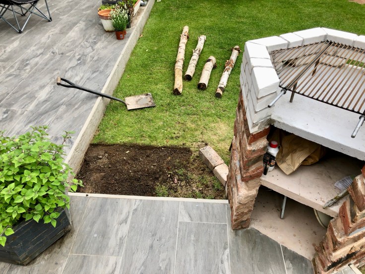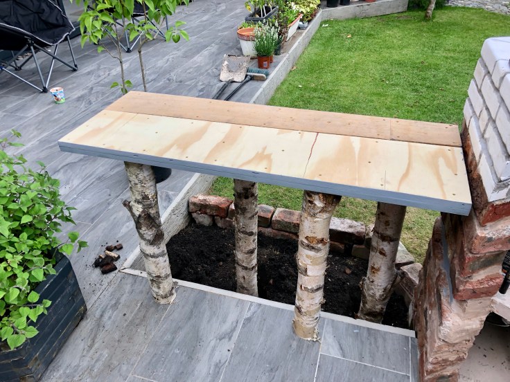 The pieces of silver birch were easily long enough to give the height we needed for a table but did look a bit odd just rising up from the lawn below. Well, the two higher ones did, as the other two were to be balanced on the flat surface of the terrace above.