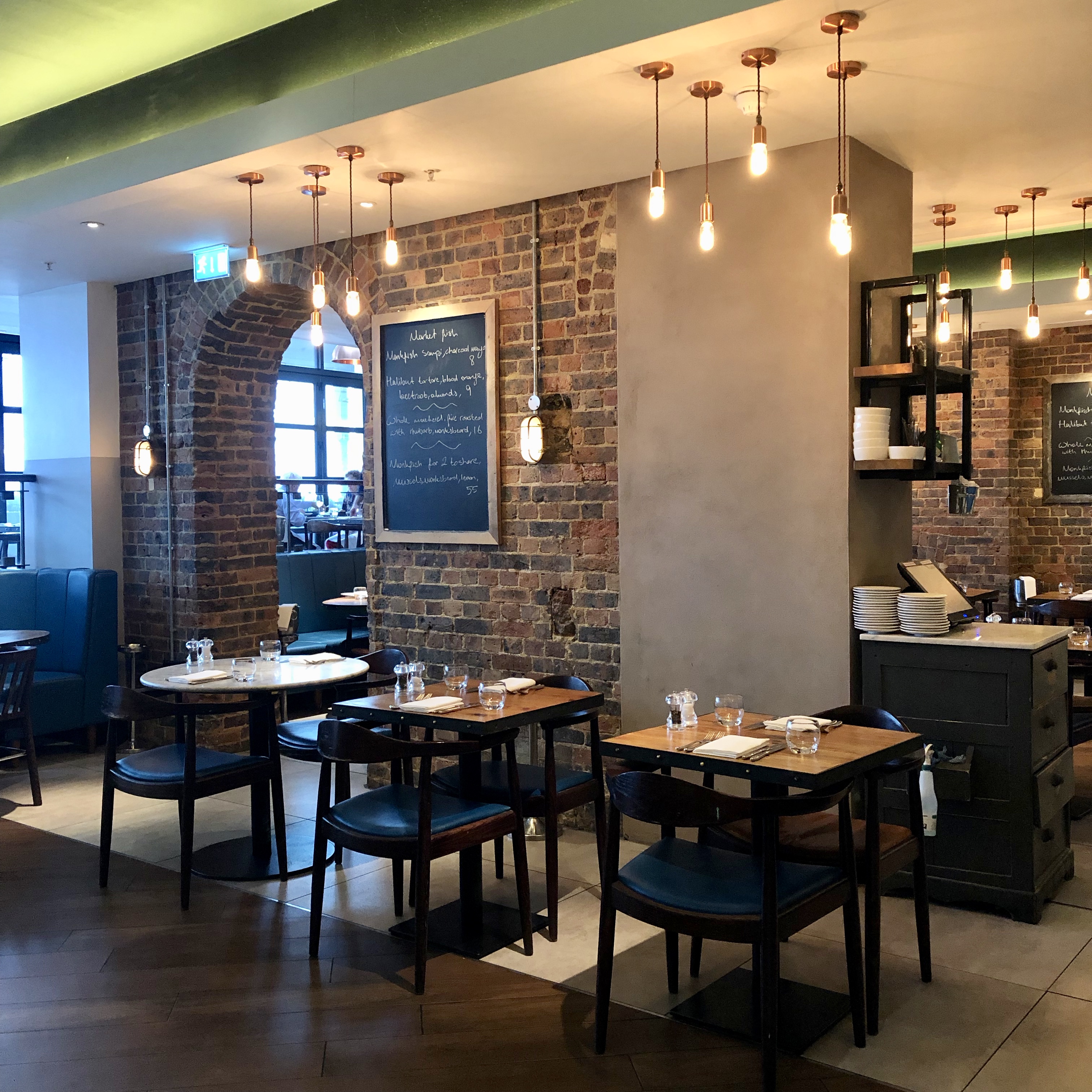 The restaurant sits squarely on the seafront, a short walk way down from the hub of the town and underneath the Hotel Metropol. Not far from the BA tower thing you can go up and down on. We stumble across it quite by accident, wandering out for a bite to eat before a long journey home. It’s a very cool exterior design, all sturdy black pillars and crisp white render. Looking this attractive on a grey drizzly day is no mean feat, as my hair on the day proves. No selfies in this blog post.