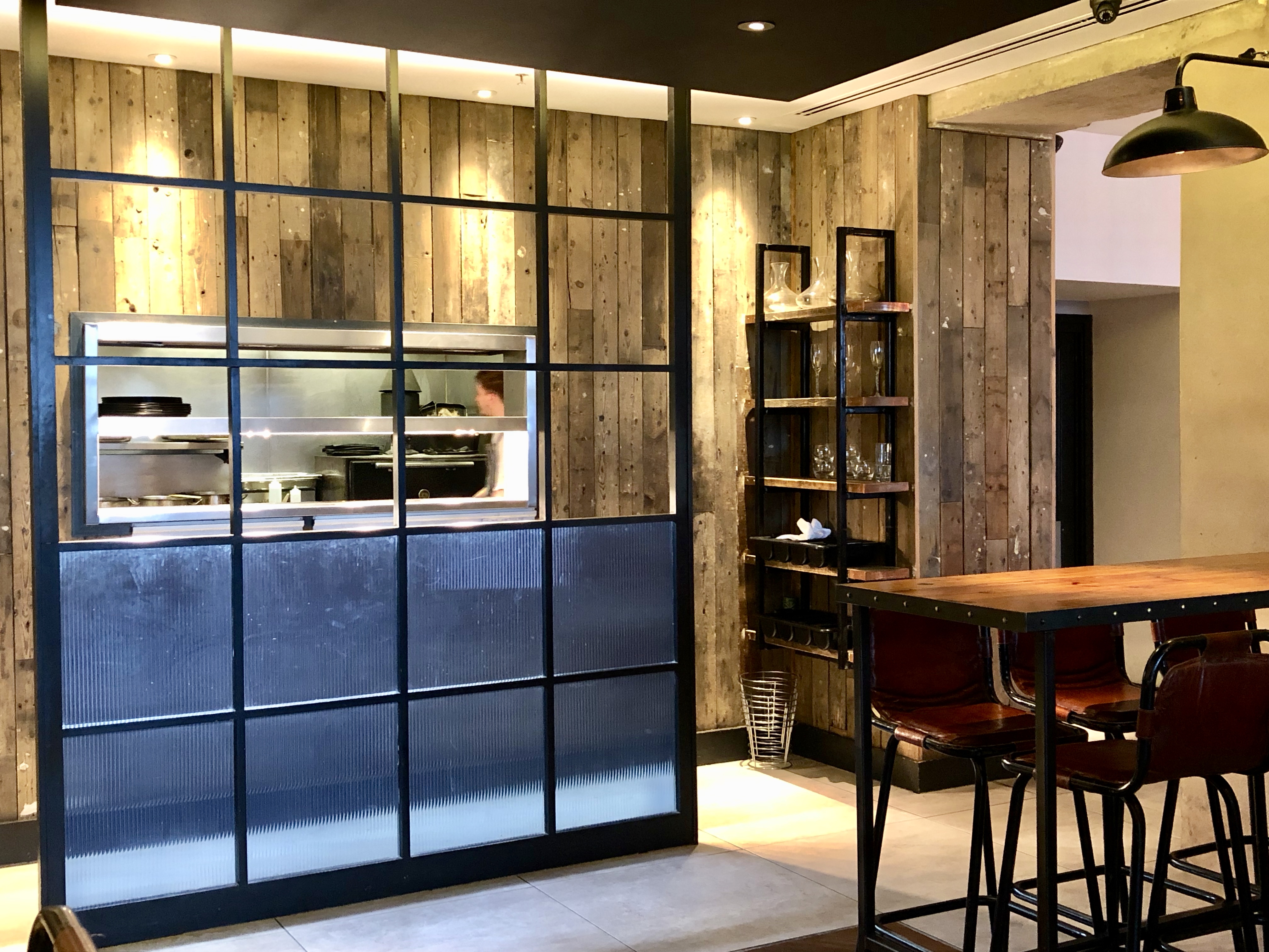 Equally stylish indoors too, soft industrial with teal leather seating, exposed brickwork and mixed metallics. Warm and inviting even when Tuesday lunchtime quiet, just us and one other large group carousing in the private dining room at the far end of the room. I already clock the champagne and oyster Wednesday special at £20 and the lunch time a la carte deal, but where there’s a platter, there’s a Moregeous smile. No chilled offering here but instead a hot Surfboard, fired up on the Josper grill. It has to be done.