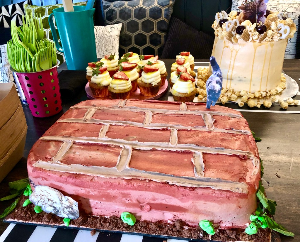 Anyone sensible always leaves room for pudding if the incredible Bakeorama is in charge of the cake table, and when true foodies are involved, everyone somehow becomes really sensible. Charlotte bakes the most spectacular creations but what elevates her to cake goddess level is the thought and care which goes into her work. Knowing our renovation passions, daily life and the Moregeous beasts, I almost couldn’t cut into the brilliant cement cake and reclaimed brick slab, decorated with images of Rocky & Builder Cat. Pure magic!!