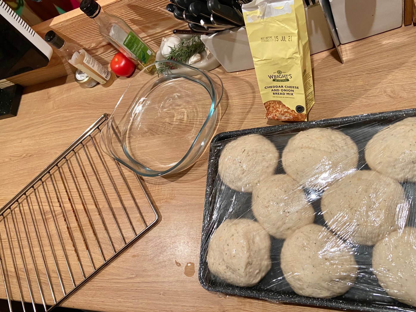 Many people don’t bake their own bread because they either don’t have a bread machine or a Bake Off style posh proofing drawer. I’d a disaster last week with some bread in our understairs cupboard next to the heating manifolds, returning to find the heating had switched itself off. The result was one flat & rock hard focaccia. More like a naan really. Revolting. Following that hiccup I got googling to try and find out what temperature to proof bread in an oven, or if that was even possible, and discovered that a bowl of boiling water on the bottom shelf of a cold oven creates a warm, damp environment perfect for proofing – result! Armed with this advice, I made some cheesy rolls today and here’s where the hack come in….