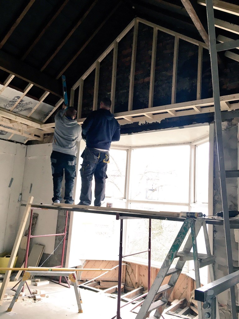 The scale of the space which needed to be lit is clear from the photos below: the first image as the builders constructed the frames to hold everything together and the second after plasterboarding had taken place. The scaffolding tower was a beast but entirely necessary, we had to support the bedroom floor from below with acrows to ensure safety due to the weight! It did make it so much easier to build the supports for the lighting to come. Not that I knew exactly what that would be when we started to build the supports, I just knew that something was going to hang from it.