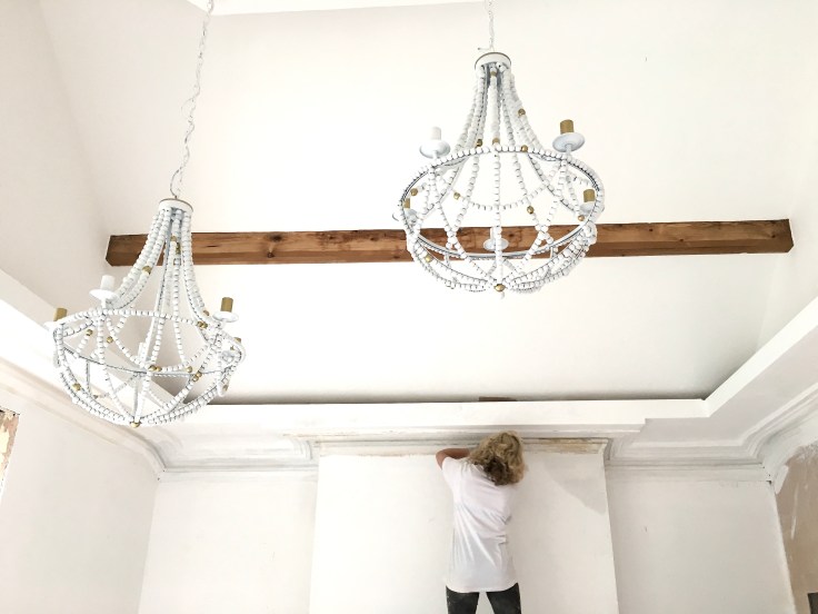 If you look back to the ceiling being constructed you’ll see the two timber legs hanging down from the ridge. From this we build a secure frame, painted it and this gave a slightly lowered area from which to suspend the chandeliers as I didn’t want them on super long cables and chains. The two now sit side by side, though at different heights, illuminating the room wonderfully. When I’ve finished the new dressing table area and wardrobes this weekend I’ll take a lovely wide shot of the room and pop it on Instagram so you can see the whole