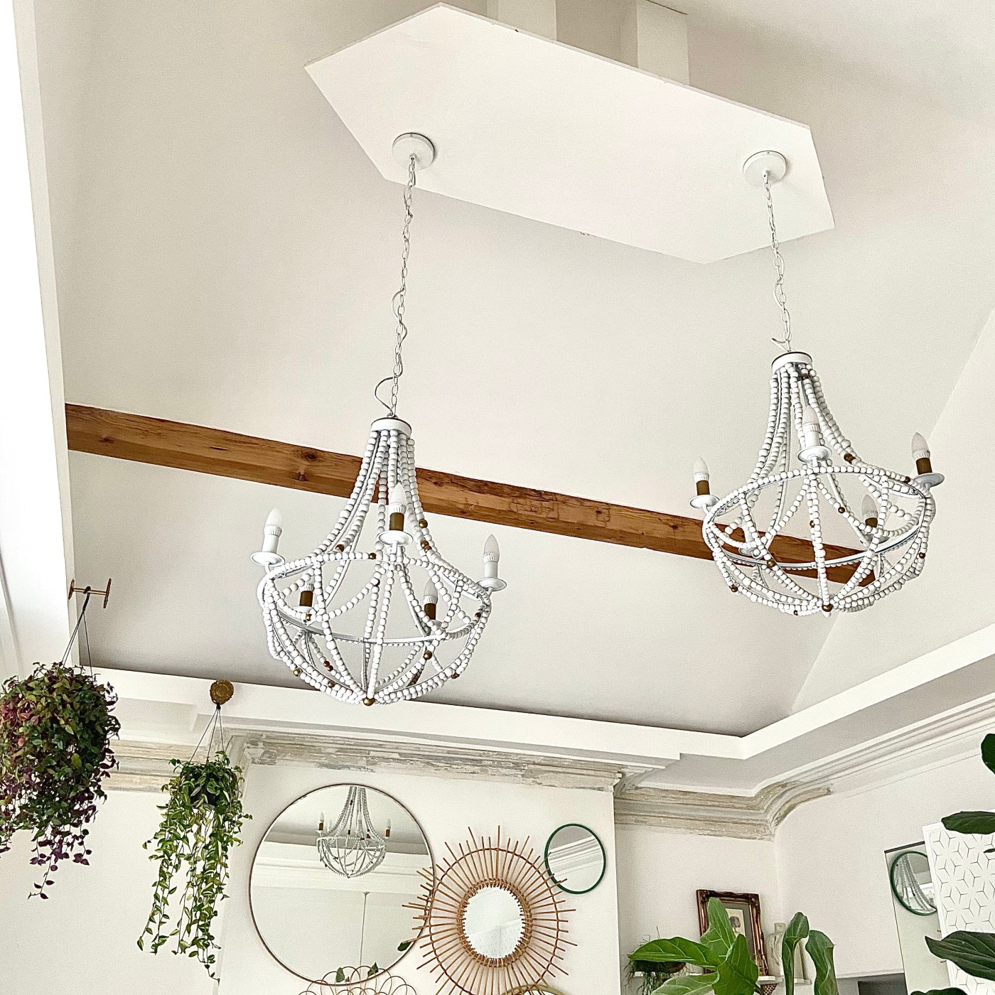 Out shopping one day, you know, back in the day when we could go shopping, I spotted these huge beaded chandeliers in the sale in BHS (RIP). Because it’s taken me a while to blog these, you can’t actually buy these ones, but the method is as relevant as ever if you wanted to find something similar and have a go yourself. I miss our local BHS lighting showroom so much, some really affordable and excellently styled options.