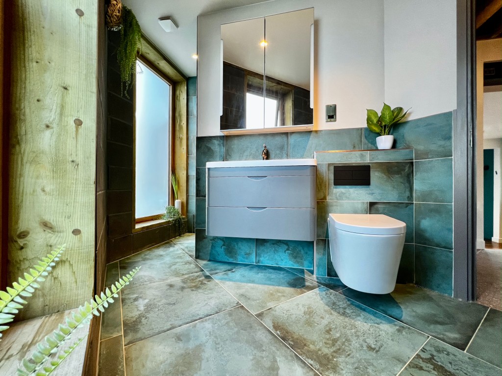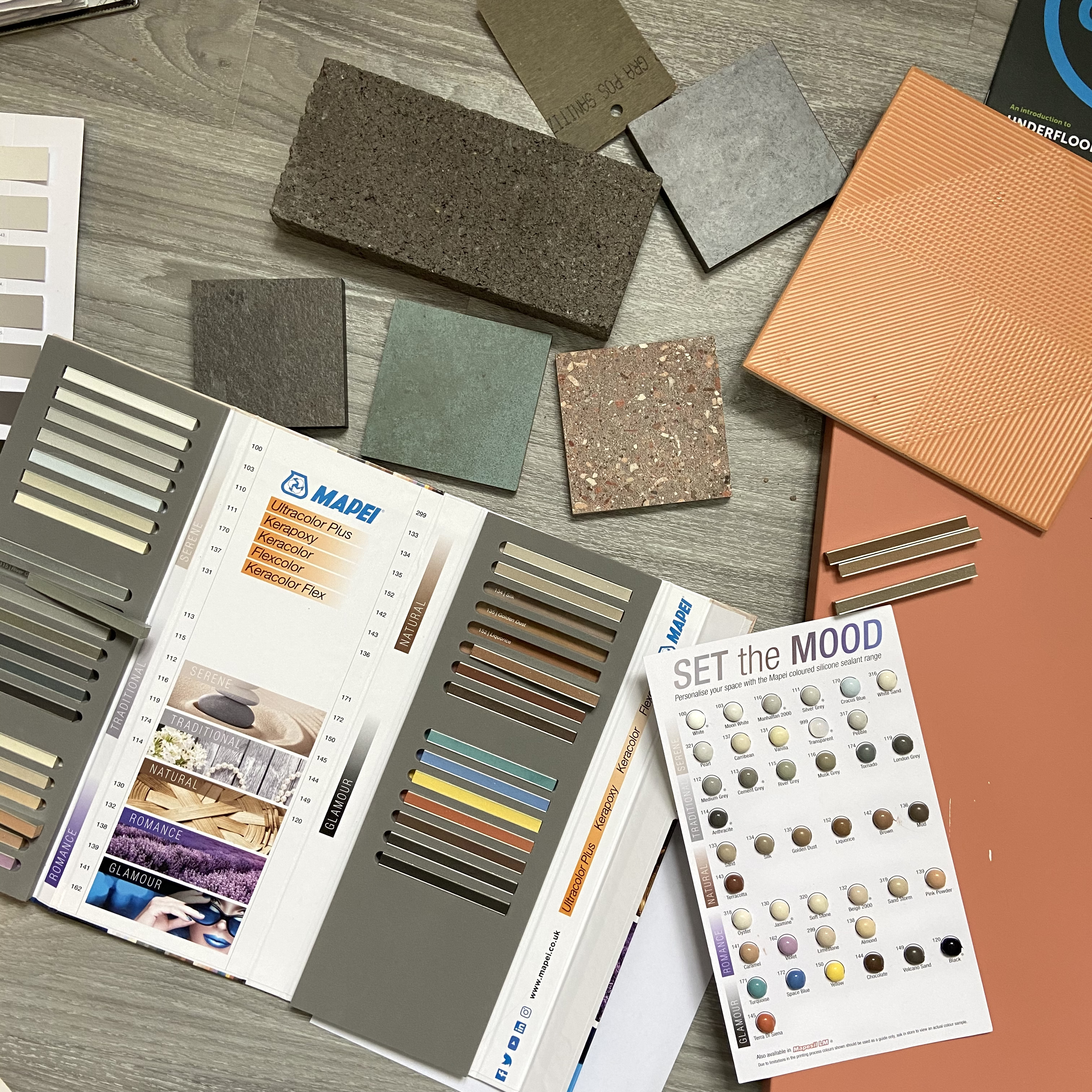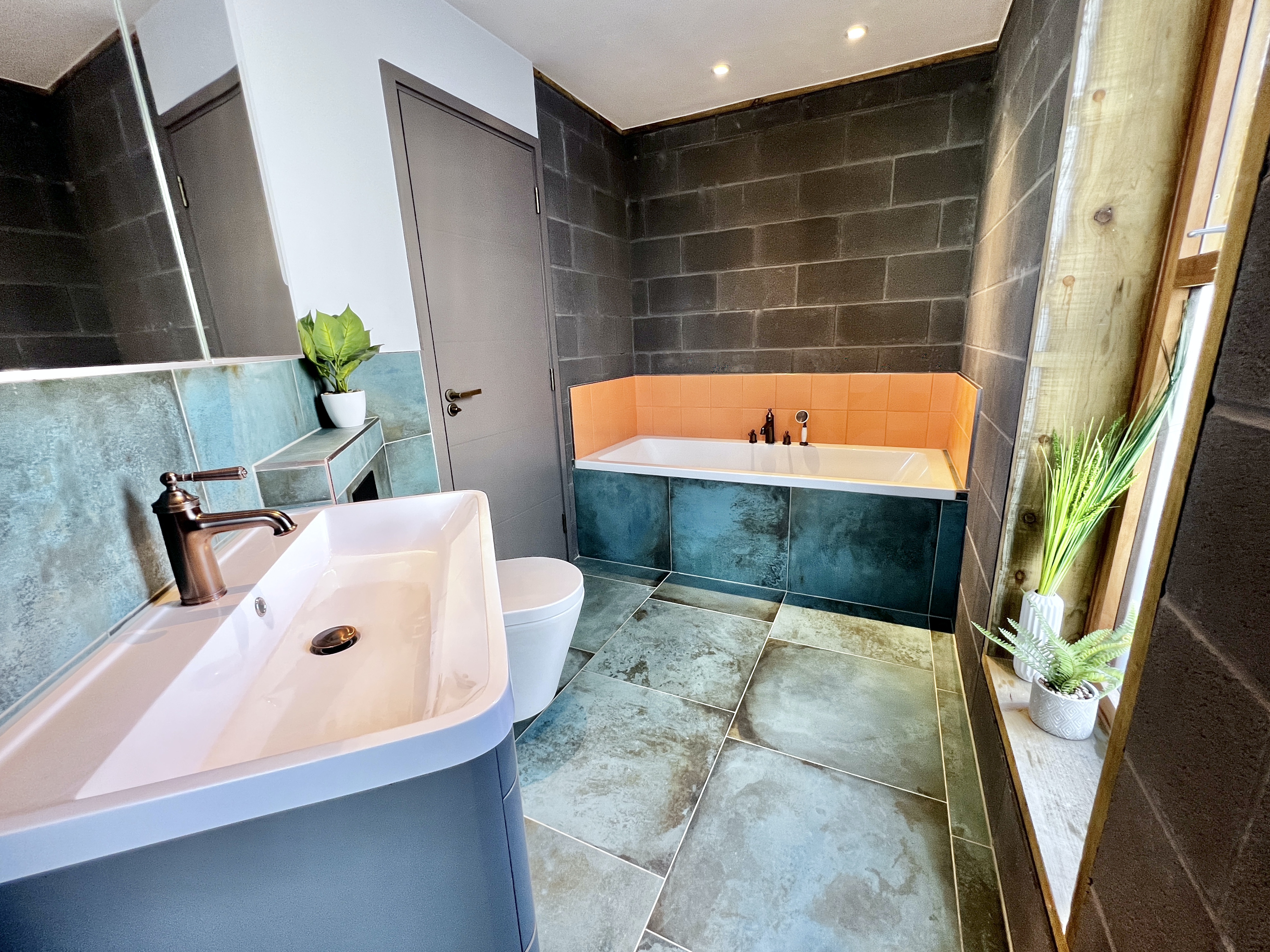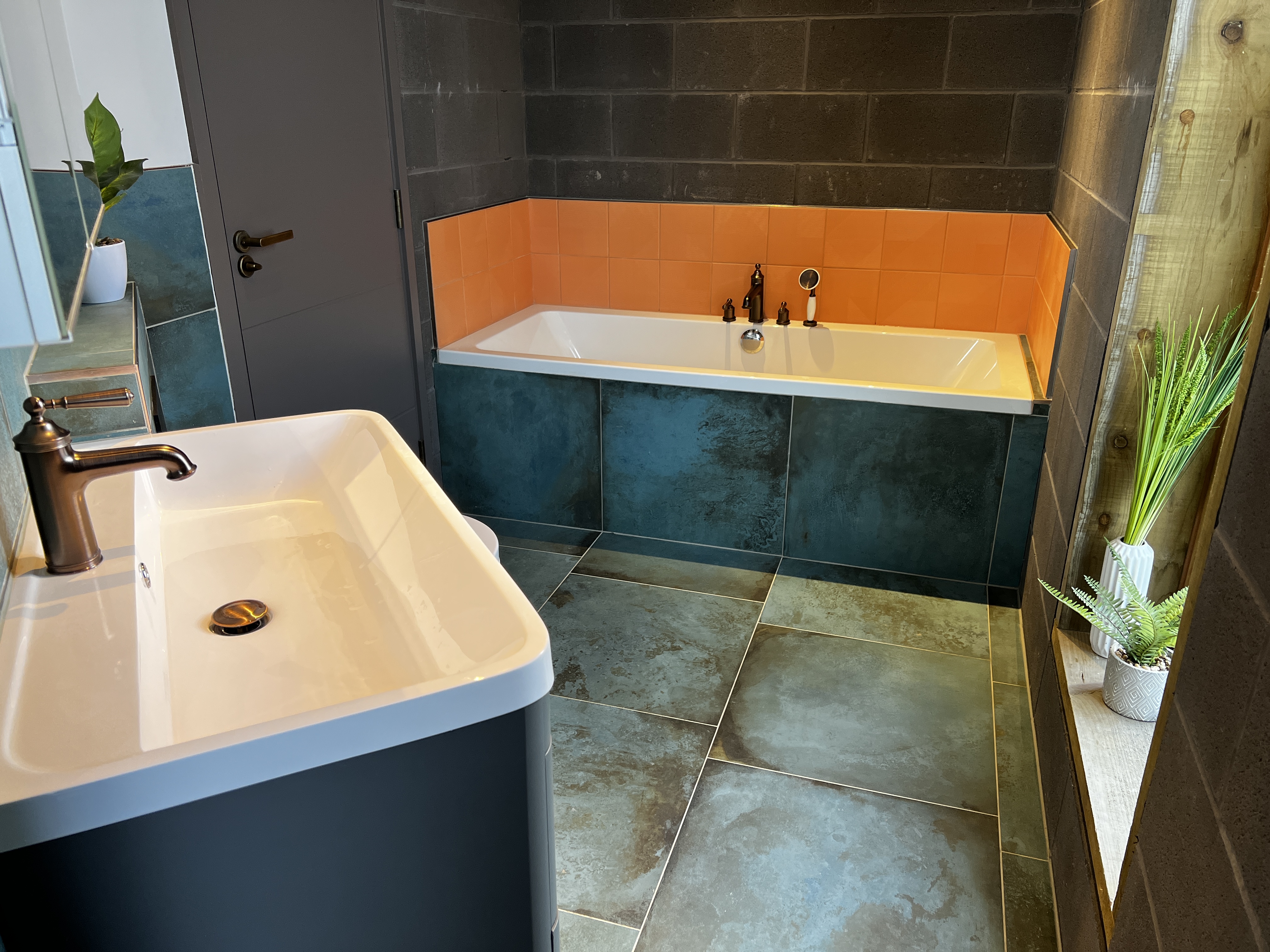 Theirs is a young family, so for the area around the bath the grey blocks needed to be protected from playtime bathroom splashes. A band of colour in the form of a fabulous 20×20 tile called Carnaby Sunset was introduced, picking up the terracotta vibes from the kitchen and carrying on this design red thread into the bathroom.