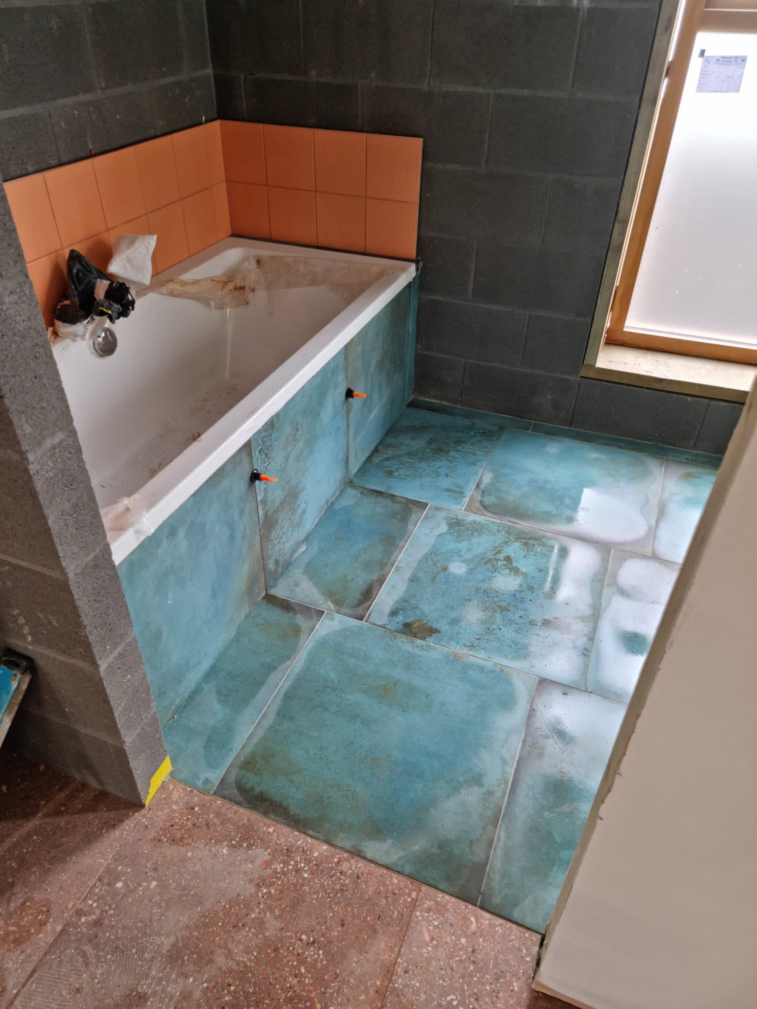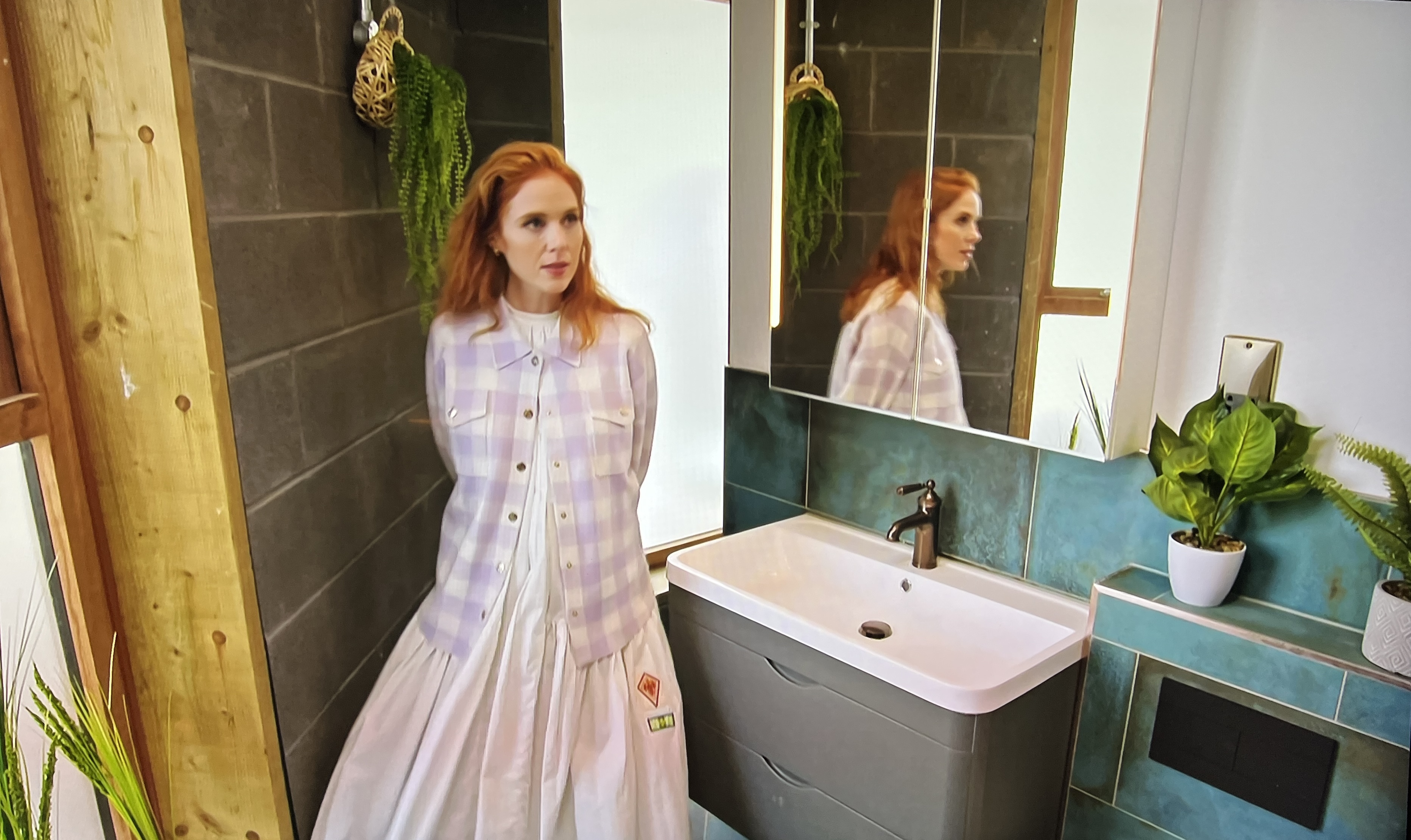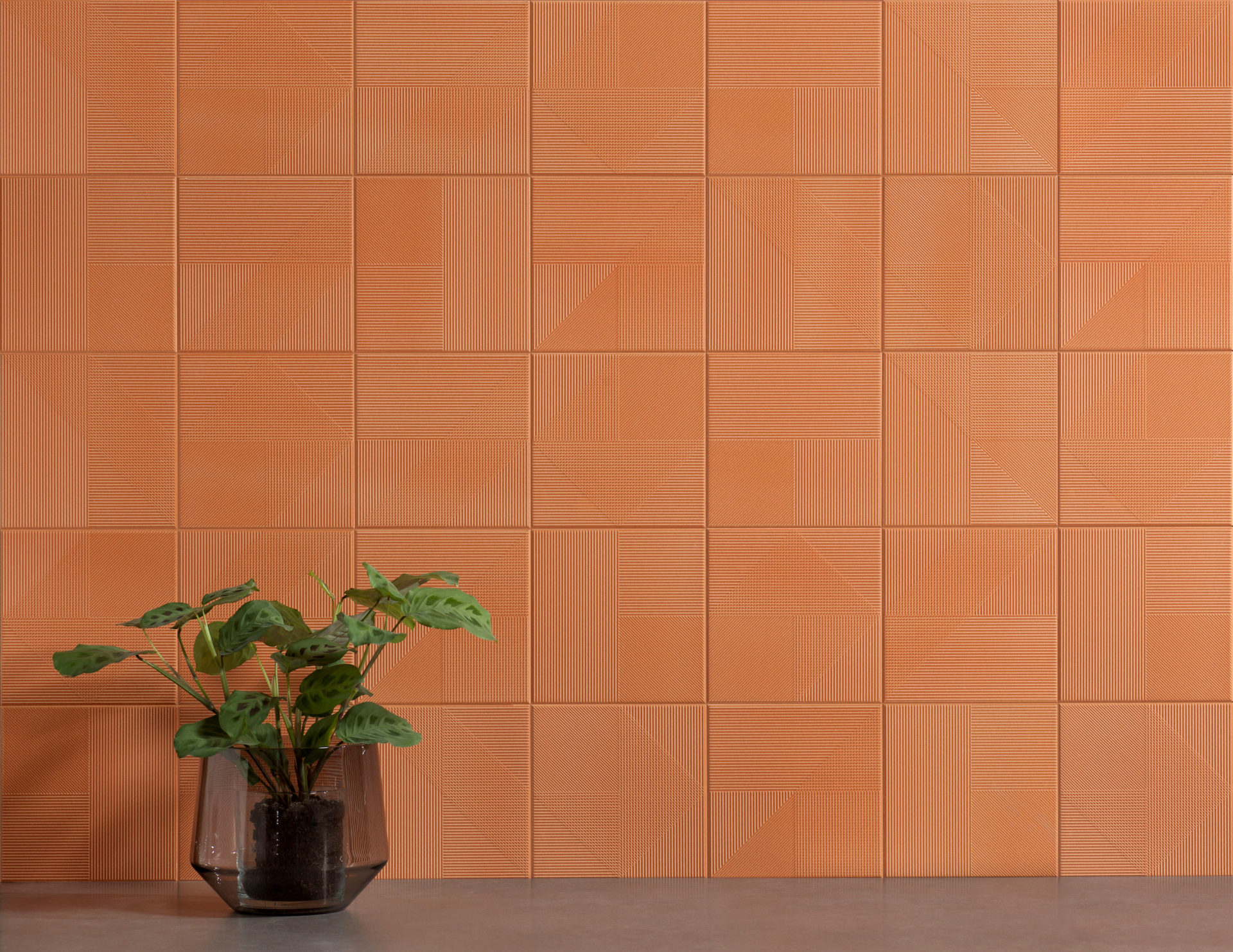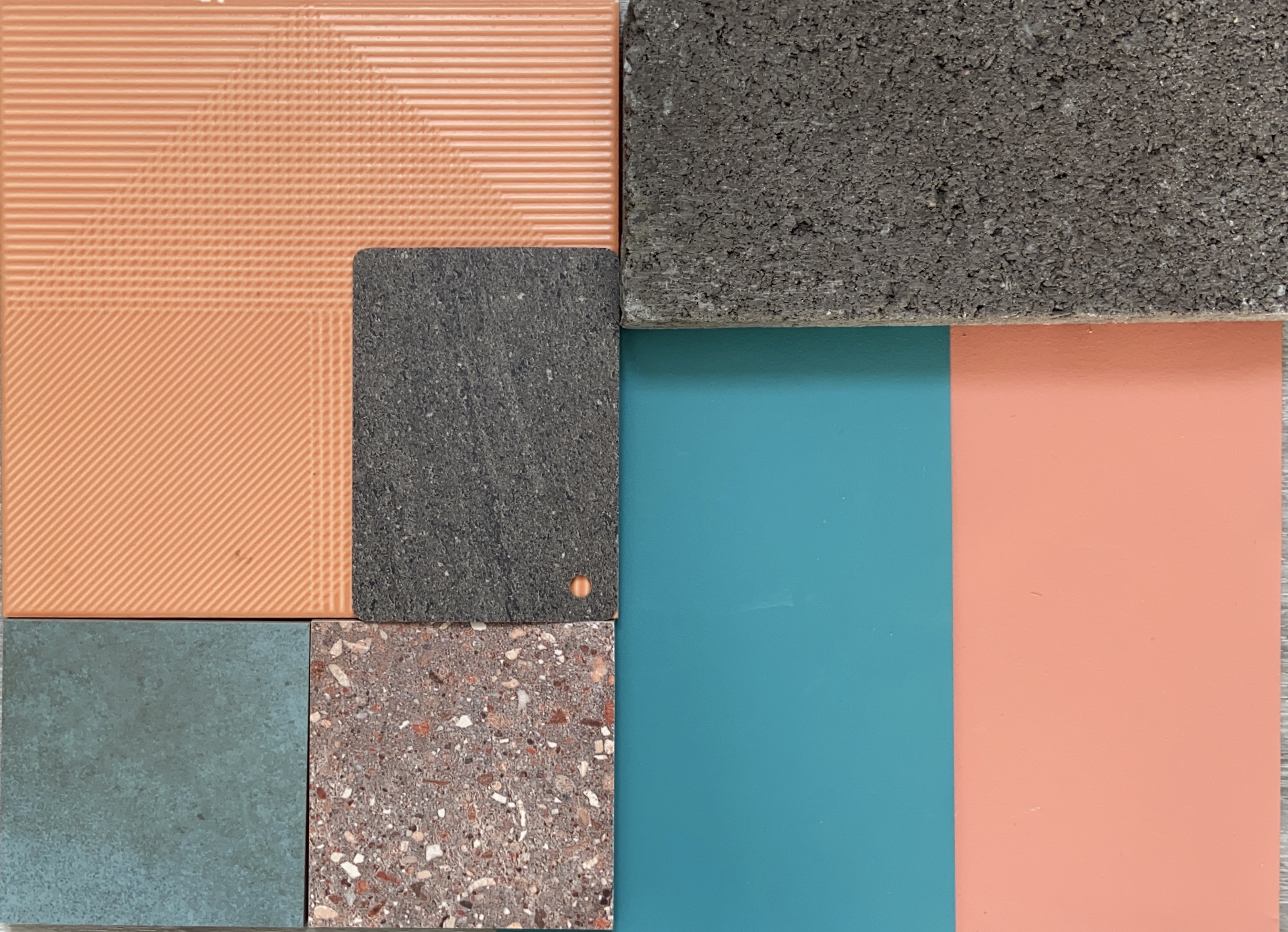 Theirs is a young family, so for the area around the bath the grey blocks needed to be protected from playtime bathroom splashes. A band of colour in the form of a fabulous 20×20 tile called Carnaby Sunset was introduced, picking up the terracotta vibes from the kitchen and carrying on this design red thread into the bathroom.