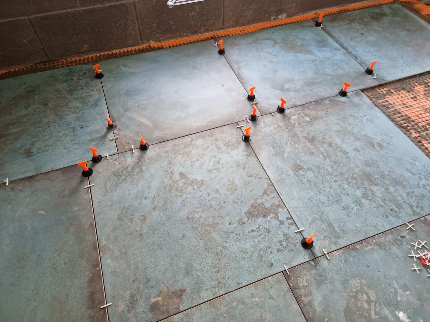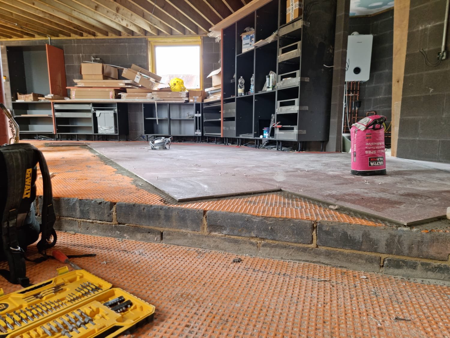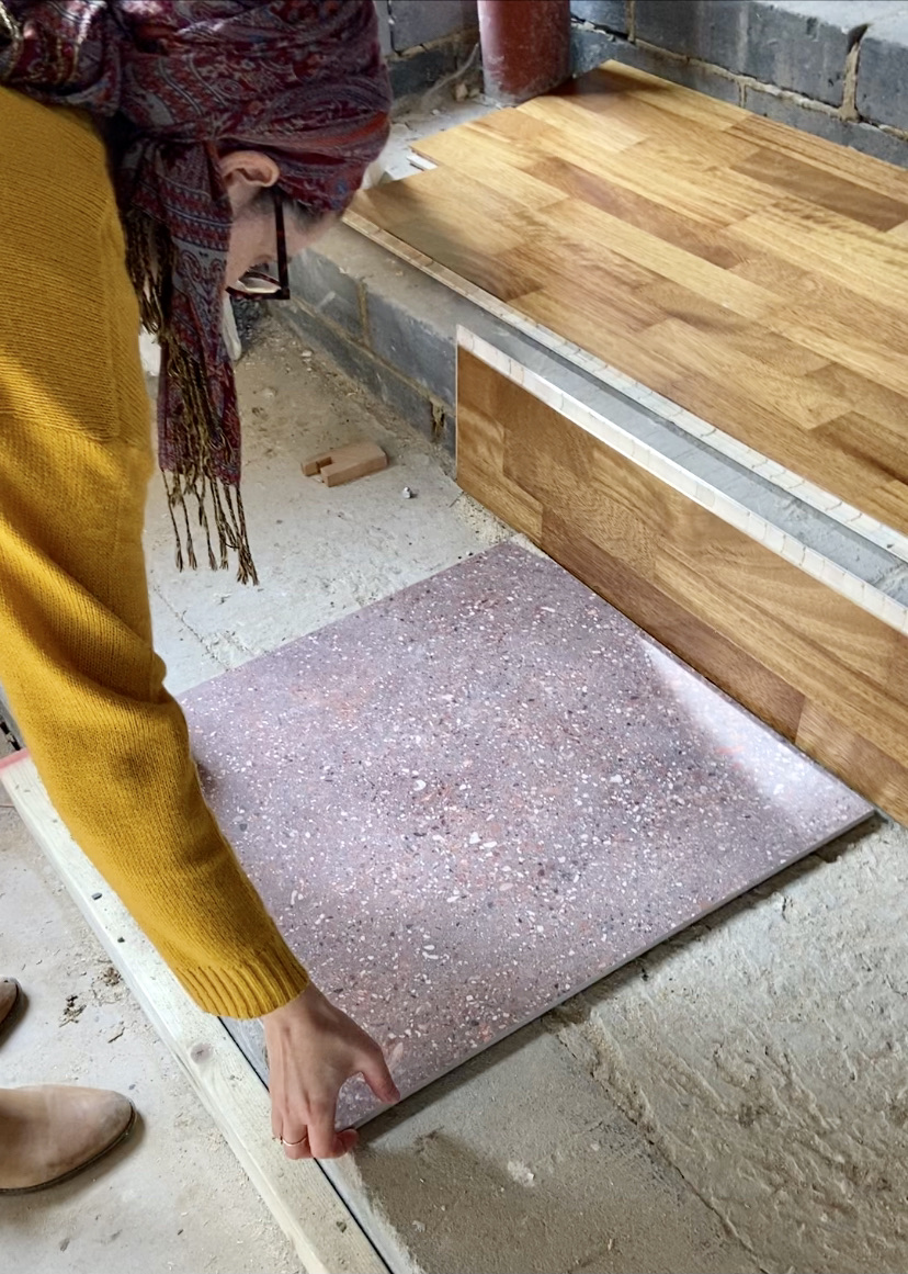 Porcelain tiles work perfectly with UFH and are super practical for such a large extension. This is a 600 x 600 tile (they do a 1000×1000 too) which needs to be laid staggered. Is it a DIY job? Probably not, large format tiles require skill to get perfectly level and spaced. The terrazzo pattern is very realistic and wonderfully character filled, a really goof quality tile. Check out Yehuda and Naomi deliberating between tiled steps and timber – decisions decisions eh – as every renovator knows, they blow your mind!