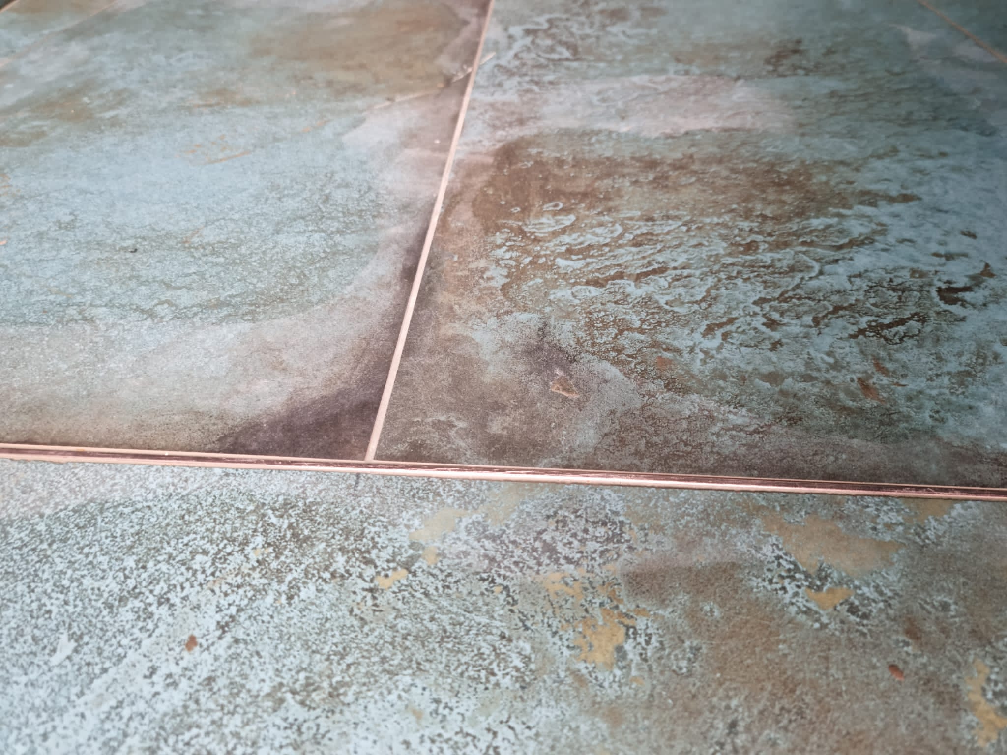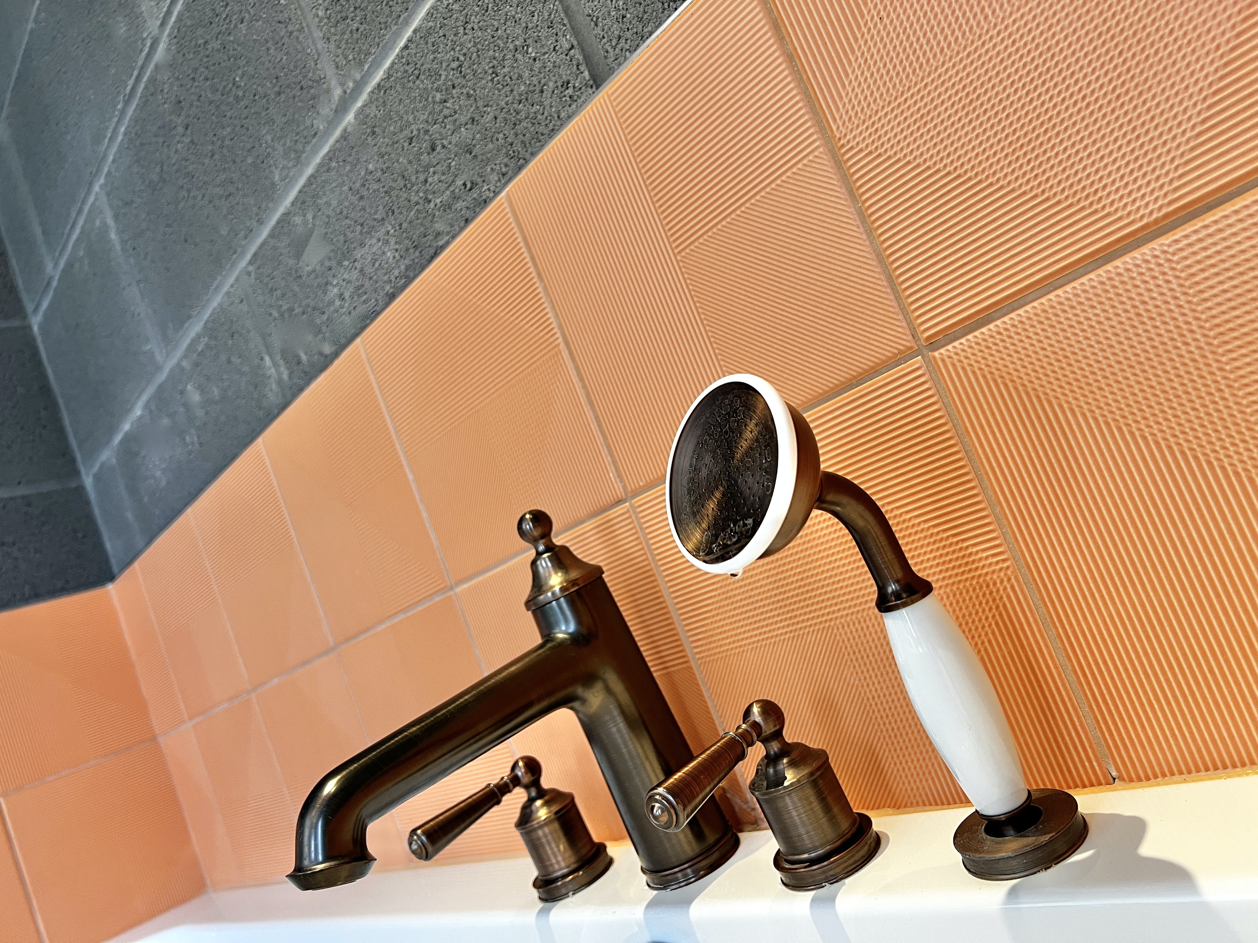 From the very beginning Yehuda wanted to introduce warm metallics into the palette of materials in the family home. so when it came to choosing tiles for the bathroom, the idea of copper and the Dabbling Duck paint colour already chosen were added into the design mix. This fabulous 300 x 600 porcelain called Verdigris came into play for both the bathroom floor and shower walls, providing a perfect backdrop for the brushed bronze fittings. For those who don’t know, verdigris is the colour which copper goes when it oxidises, making a design connection between the materials chosen.