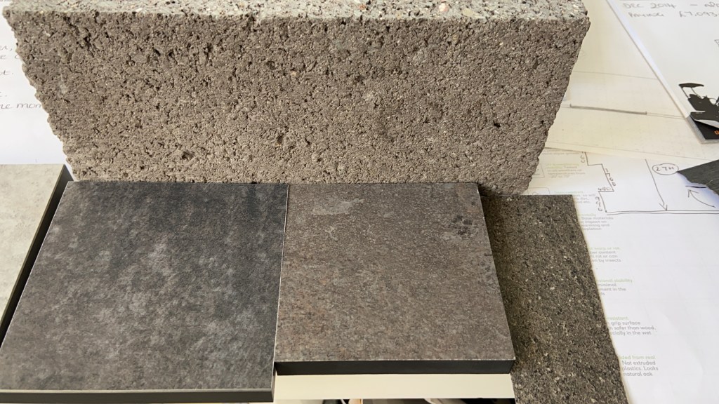 I’d actually specified the Zenith before, a superb compact laminate worktop by Wilson Art which is as strong as an ox, super slim, beautifully textured and cuts on site – that’s a lot of boxes ticked right there. But we still went through the process of looking at lots of samples on the market to find the best one with the Colinwood blocks. Look below – which one would you have chosen?