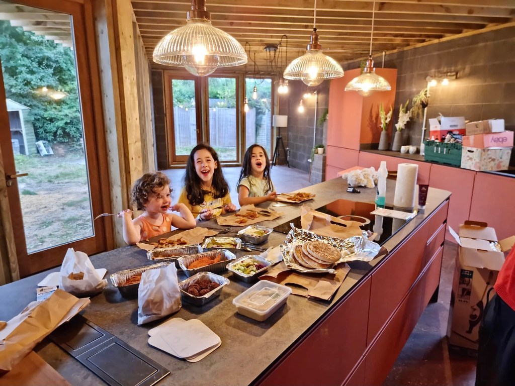 You have no idea how many worktop samples were cast aside before we arrive at the perfect one: the one which worked with the grey blocks and terrapotta doors, the one which had texture, the one which wasn’t too shiny, the one which could be 3m long, the one which wasn’t 40mm deep – crikey, so many variables. I could show you a super slick image of a clear and brochure ready worktop but this, this is a kitchen. This is life happening right here on a worktop and I’m here for it. A trio of gorgeous girls, a takeaway and pure joy at being in their home.
