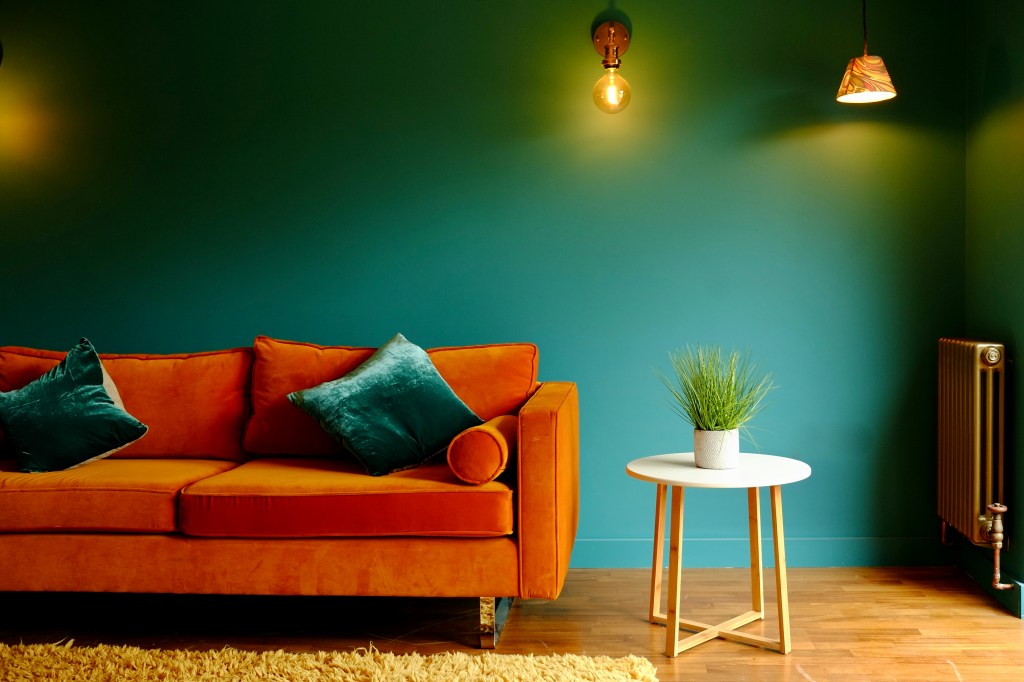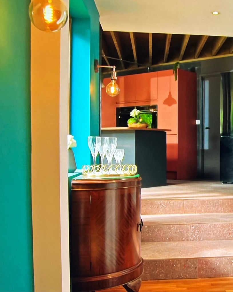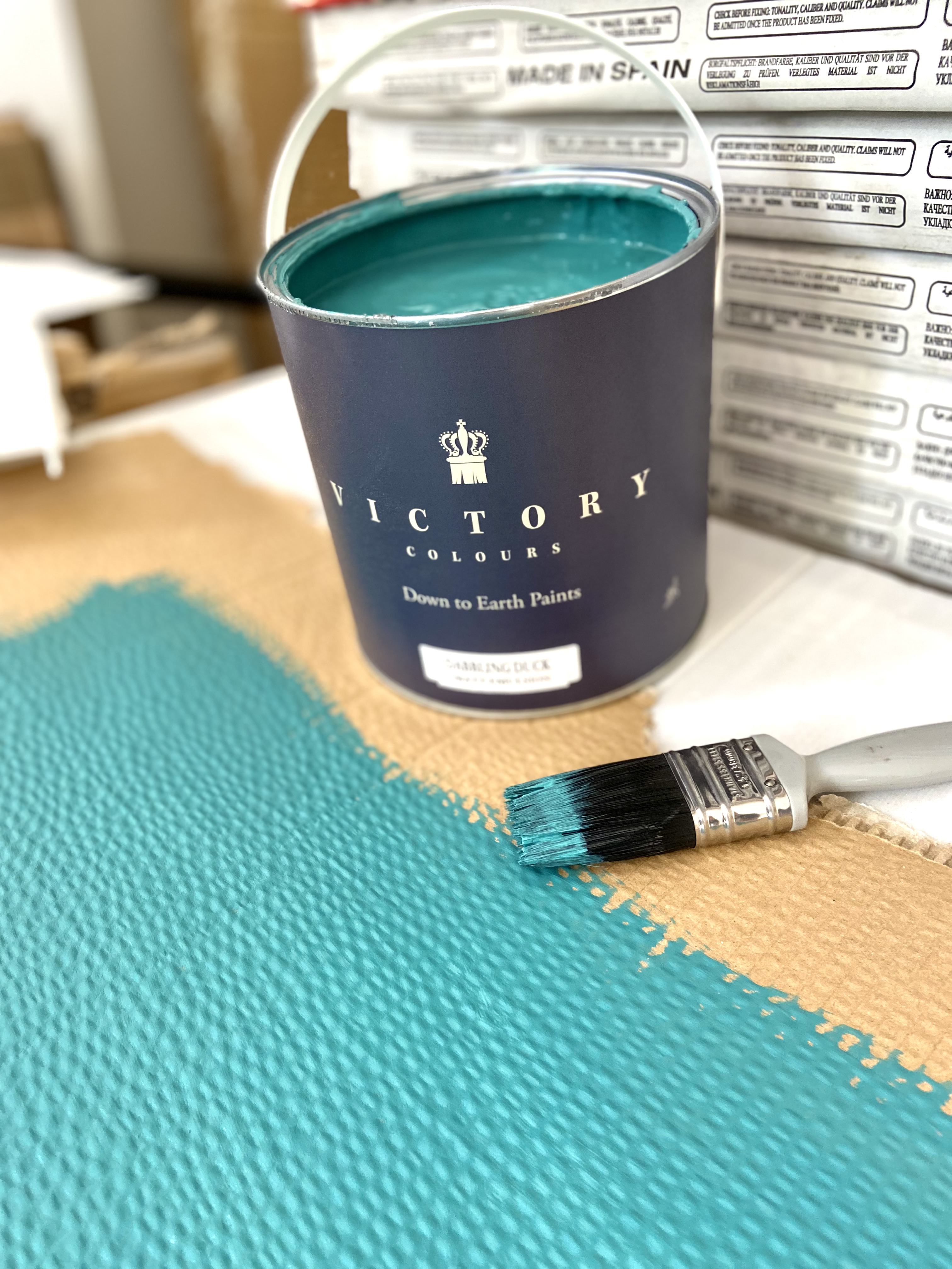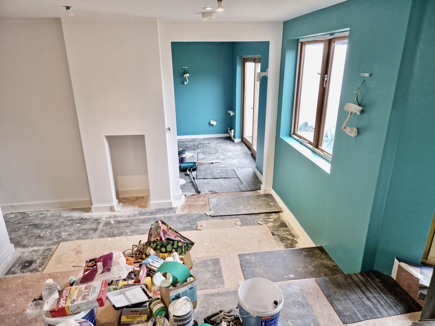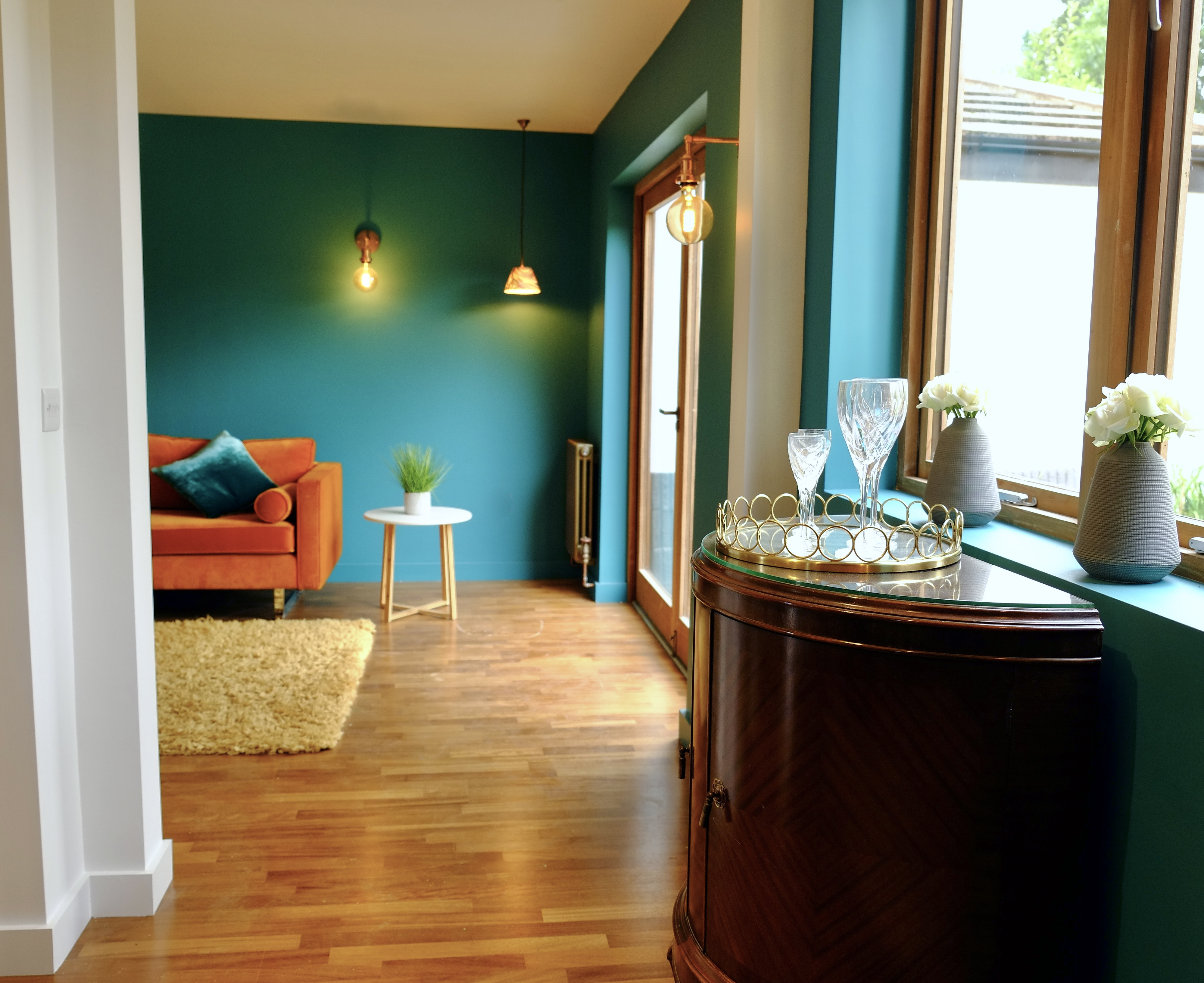 Talking of the Victory wall paint range, Yehuda and Naomi were captivated by the delightfully named Dabbling Duck for the withdrawing room walls, creating a cosy, family space. I absolutely adored it when we put these two colours together, the rust and the teal. Feels very contemporary yet still warm and inviting, you can see them next to each other on the paint swatches in the very first image in this post. It’s amazing how different the colour appears at night behind the filament lamps and then in daylight in the ‘during’ shot as the build was coming to completion. Nice coverage too!