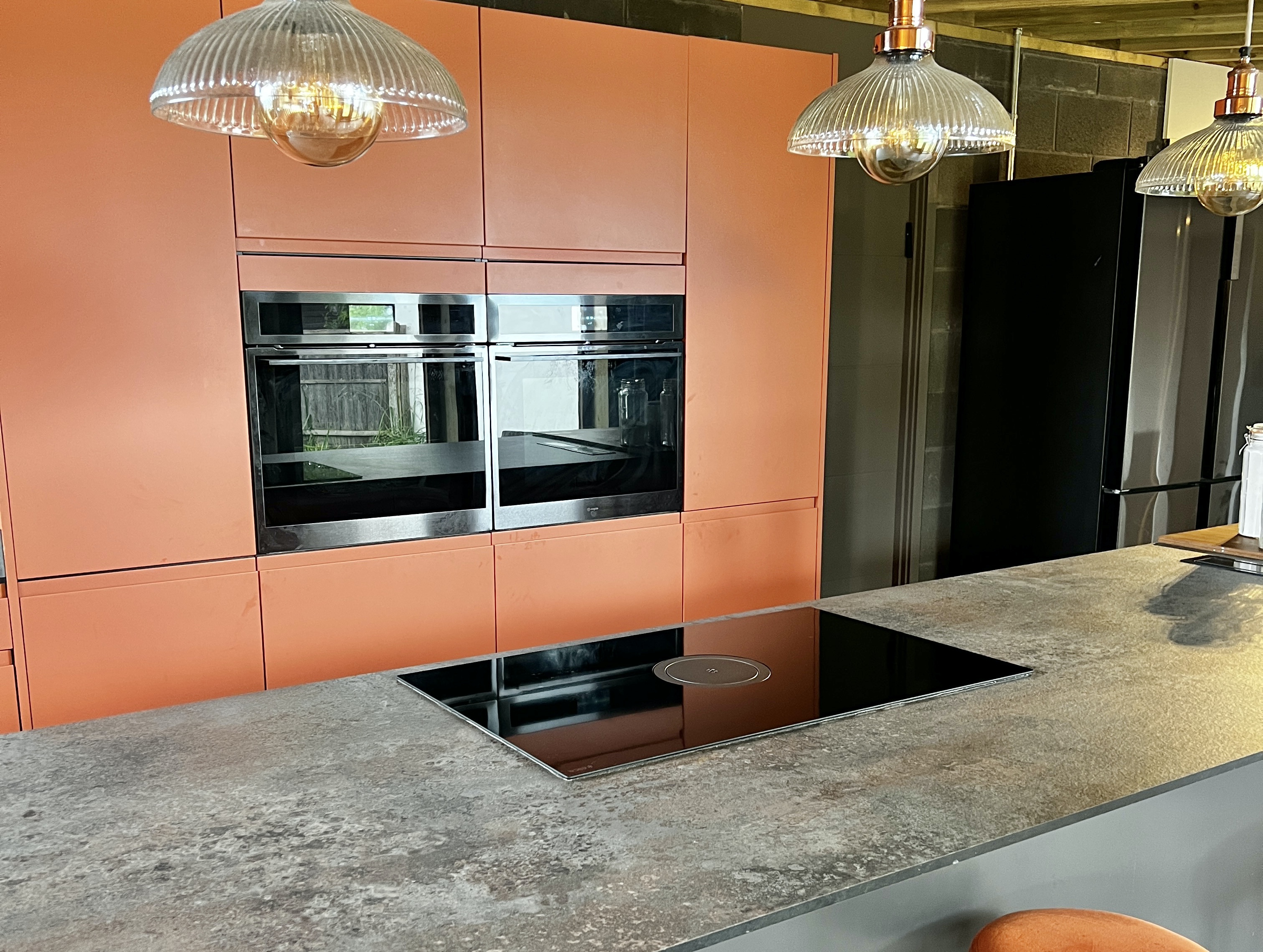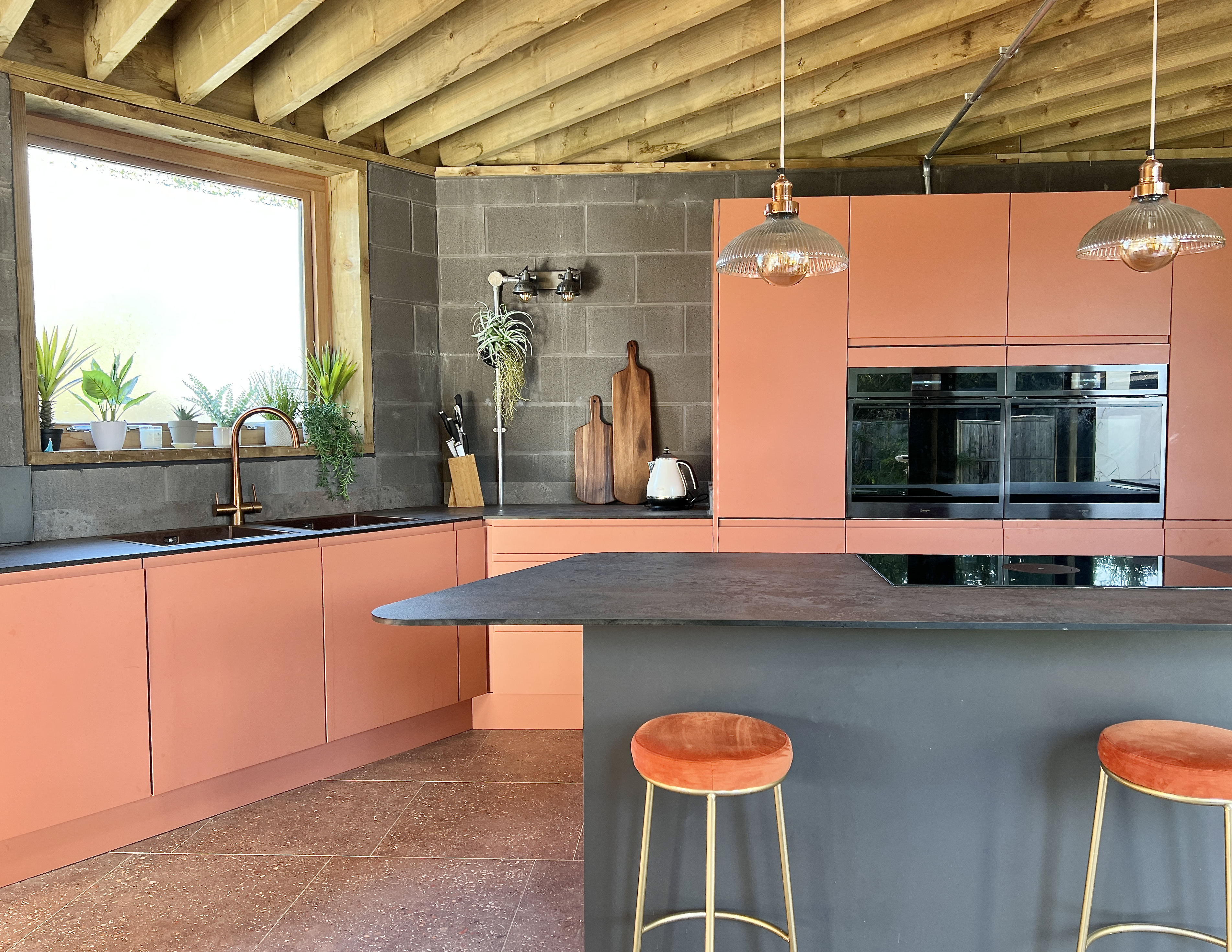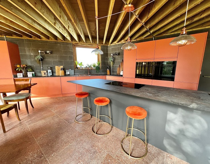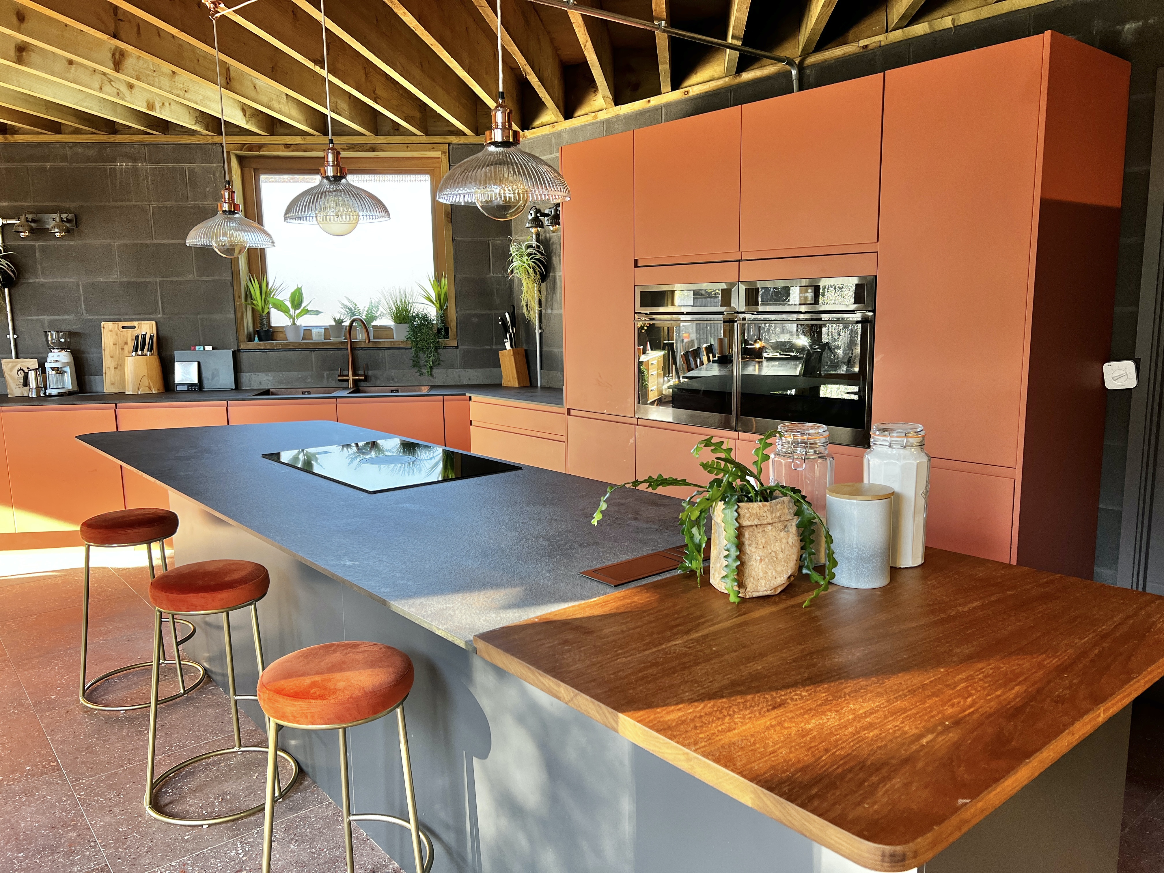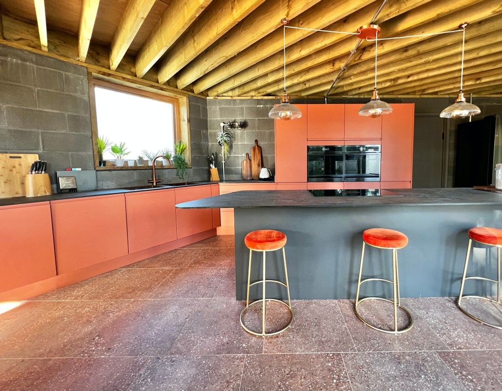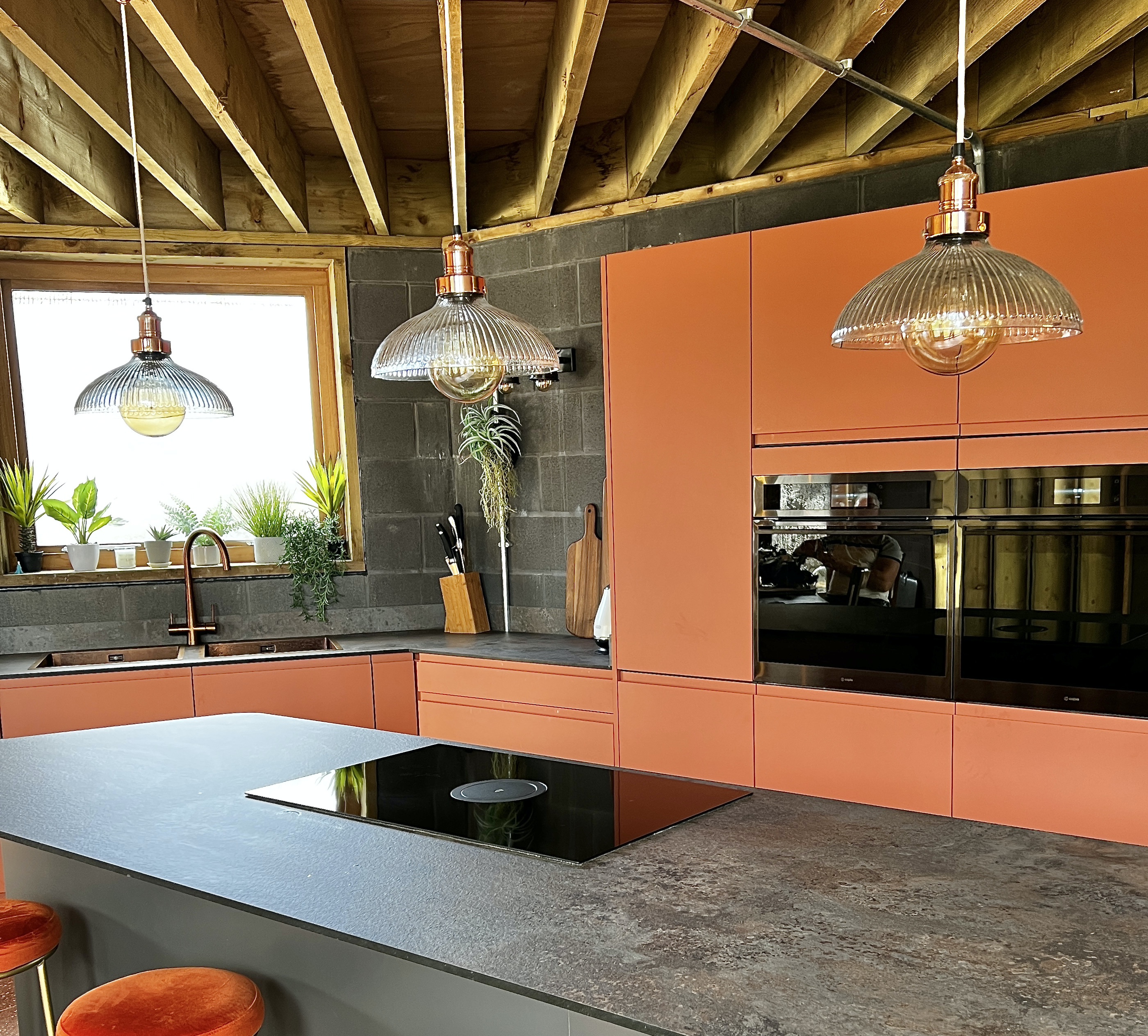 Once the walls shade-shifted to dark grey instead of earth toned, with the pine ceiling absorbing even more light, a whole new slant was needed for the kitchen cabinetry. What was required was a lift, a punch of colour, a surprise if you like, and what’s more punchy than a vibrant, sunset inspired hue. Warming up the room and creating a vivid contrast to the blockwork, the Terrapotta shade by Victory Colours was used as inspiration for the painting of sprayable kitchen doors and end panels. It’s becoming increasingly common for clients to want to add their own stamp to kitchens instead of buying ‘the same’ colour as other customers, with many ranges now being paintable, or sprayable for a smooth, more perfect finish. You can do this yourself or there are specialist companies who can do it for you.