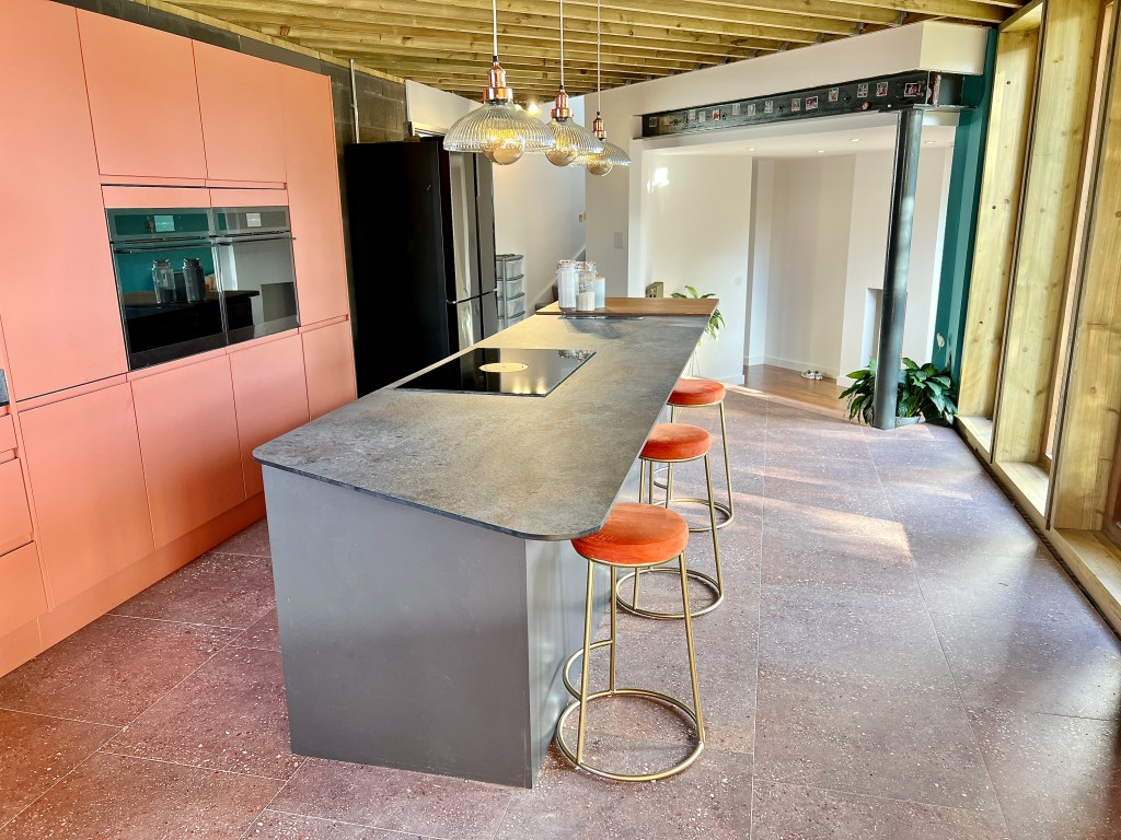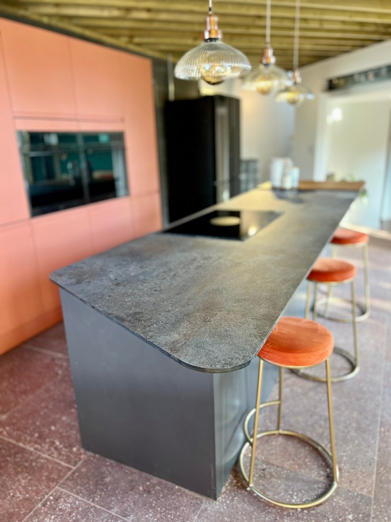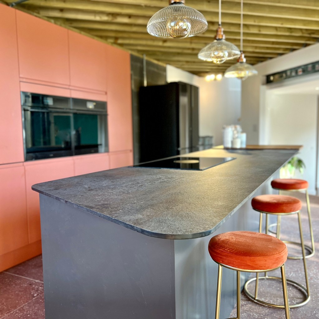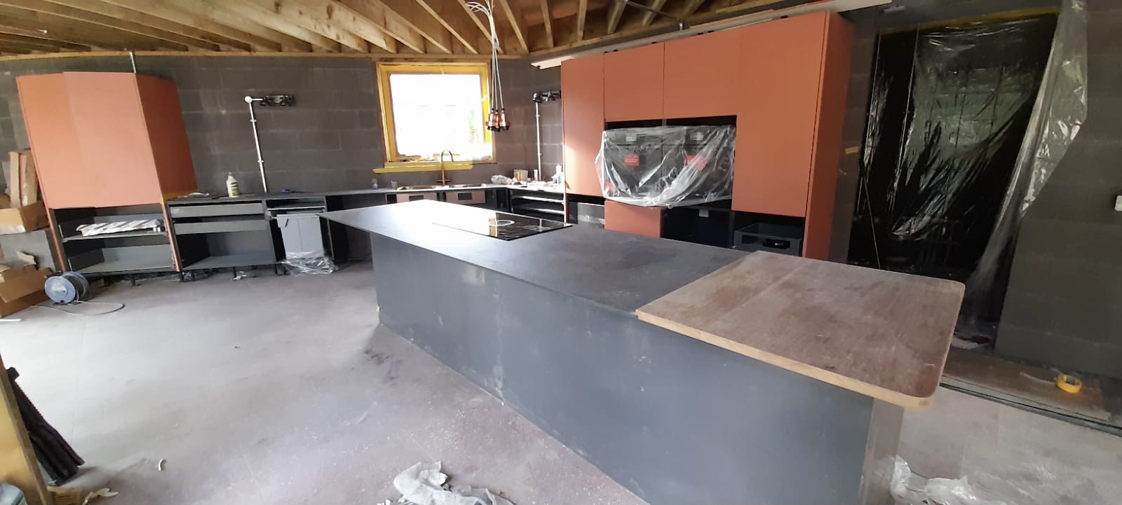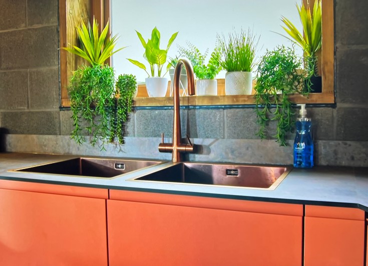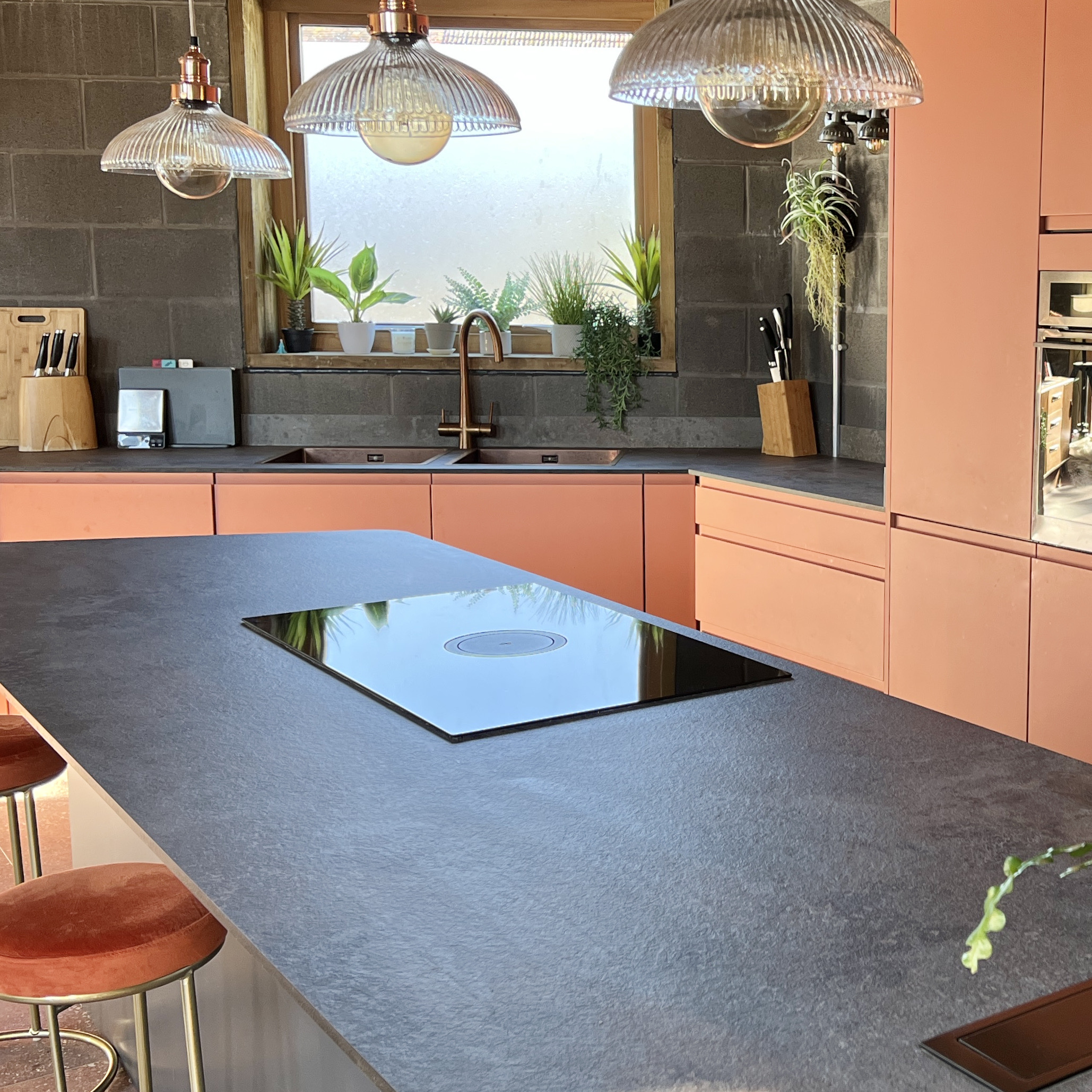 Once the walls shade-shifted to dark grey instead of earth toned, with the pine ceiling absorbing even more light, a whole new slant was needed for the kitchen cabinetry. What was required was a lift, a punch of colour, a surprise if you like, and what’s more punchy than a vibrant, sunset inspired hue. Warming up the room and creating a vivid contrast to the blockwork, the Terrapotta shade by Victory Colours was used as inspiration for the painting of sprayable kitchen doors and end panels. It’s becoming increasingly common for clients to want to add their own stamp to kitchens instead of buying ‘the same’ colour as other customers, with many ranges now being paintable, or sprayable for a smooth, more perfect finish. You can do this yourself or there are specialist companies who can do it for you.