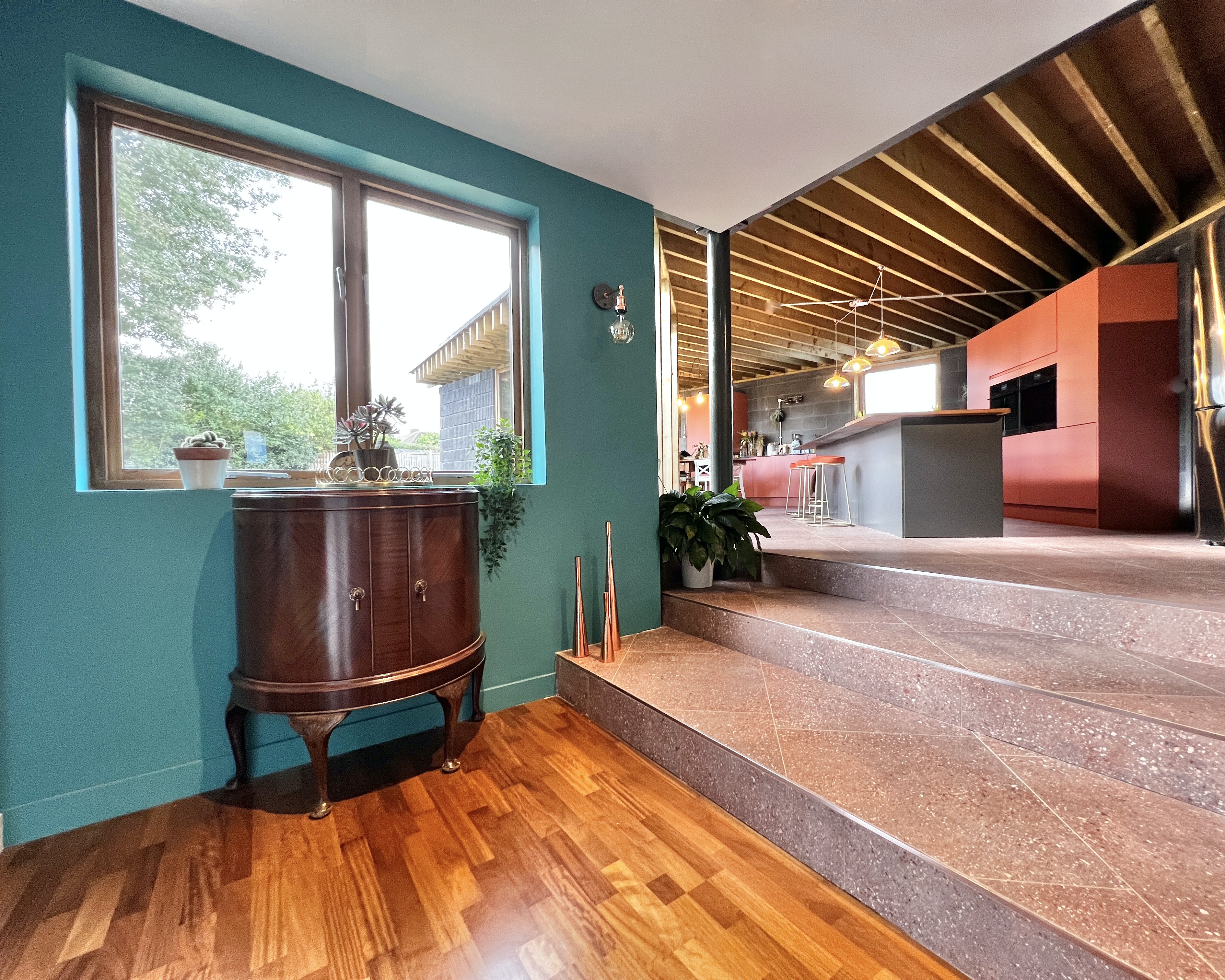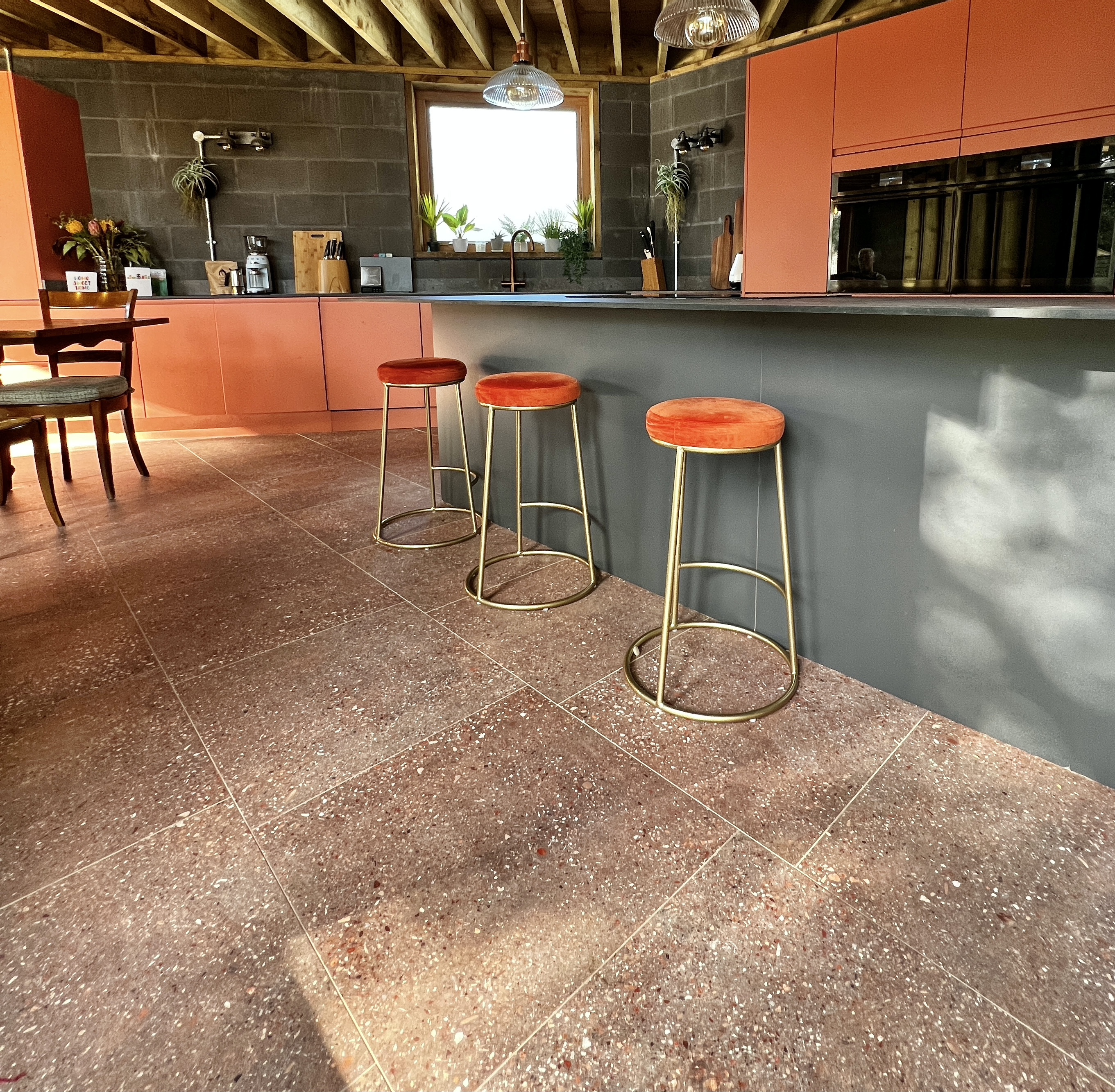 On Robert’s original VR warm toned herringbone walnut flooring flowed through the kitchen, down the huge steps and into the original property, however changes were made due to the practicality of kitchen use and lots of external doors – wood scratches very easily when people are in and out of a garden and can become very damaged by kitchen spills. The updated design shifted to a fabulous terrazzo/concrete porcelain tile by a company I’ve specified many times, Mandarin Stone, called Hendrix Red, laid on the diagonal. We actually took around 10 tiles out of the boxes and physically laid them out on the floor to work out the best pattern as the extension is such an unusual shapes, with no right angles or simple lines to follow. A real head scratcher. We decided to come off the oven wall above at 90* which meant they hit the steps on the diagonal. Always get your tiles out and have a play to ascertain the perfect way to lay them #toptip