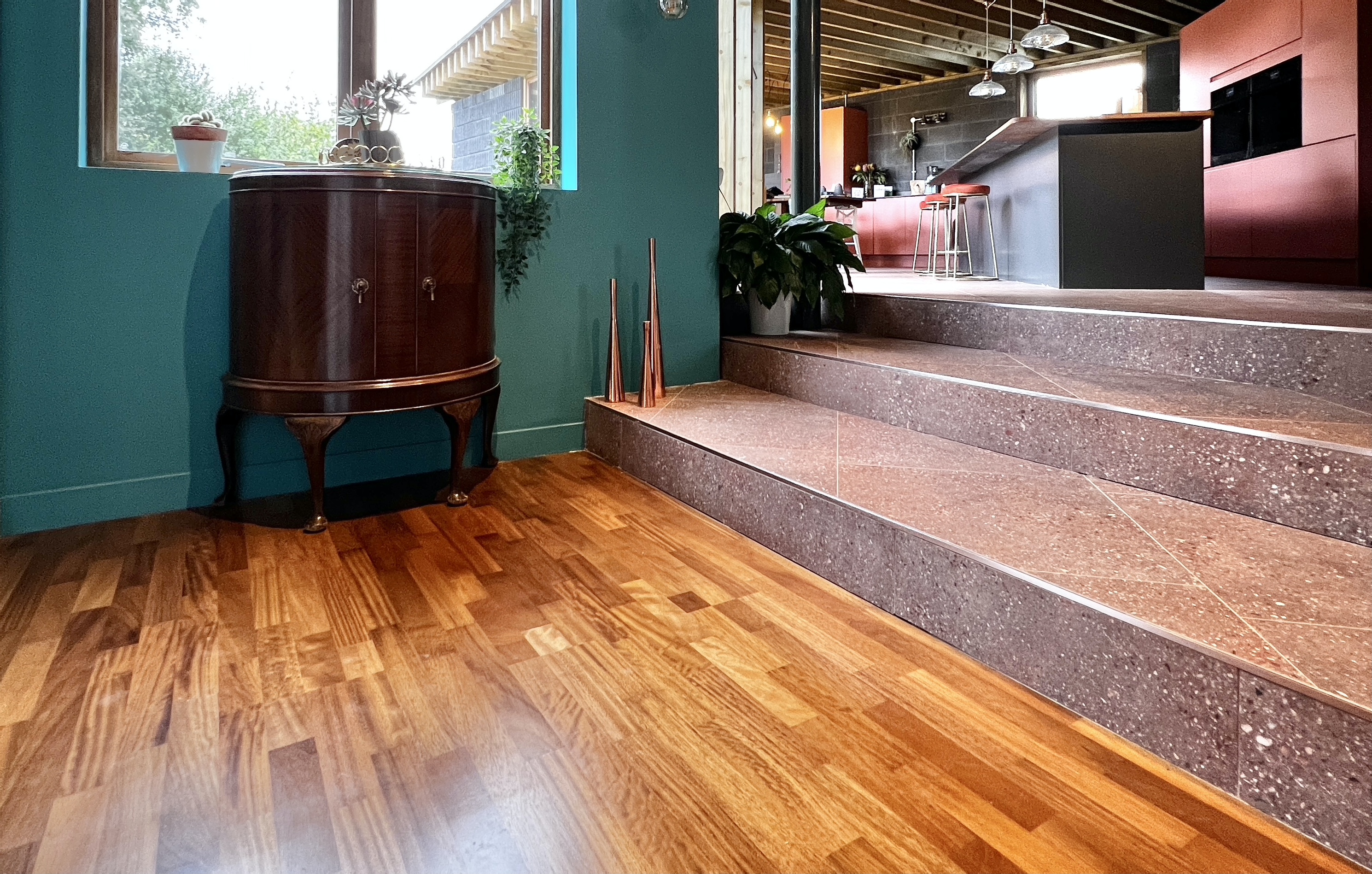 Iroko is a rich tropical wood, able to be used both indoors and out due to it’s high oil content. The actual timber can vary widely in shade and tone, and from almost yellow to deep brown. We sourced a good quality Kahrs engineered wood floor for whole of the original house which you can see it in the withdrawing room below. Top tip – contact companies for end of line bargains, you can often get top quality floors for a fraction of their original price. We found this floor at Flooring Supplies, who gave us great advice throughout and stored the floor ’til we needed it – thanks guys!!