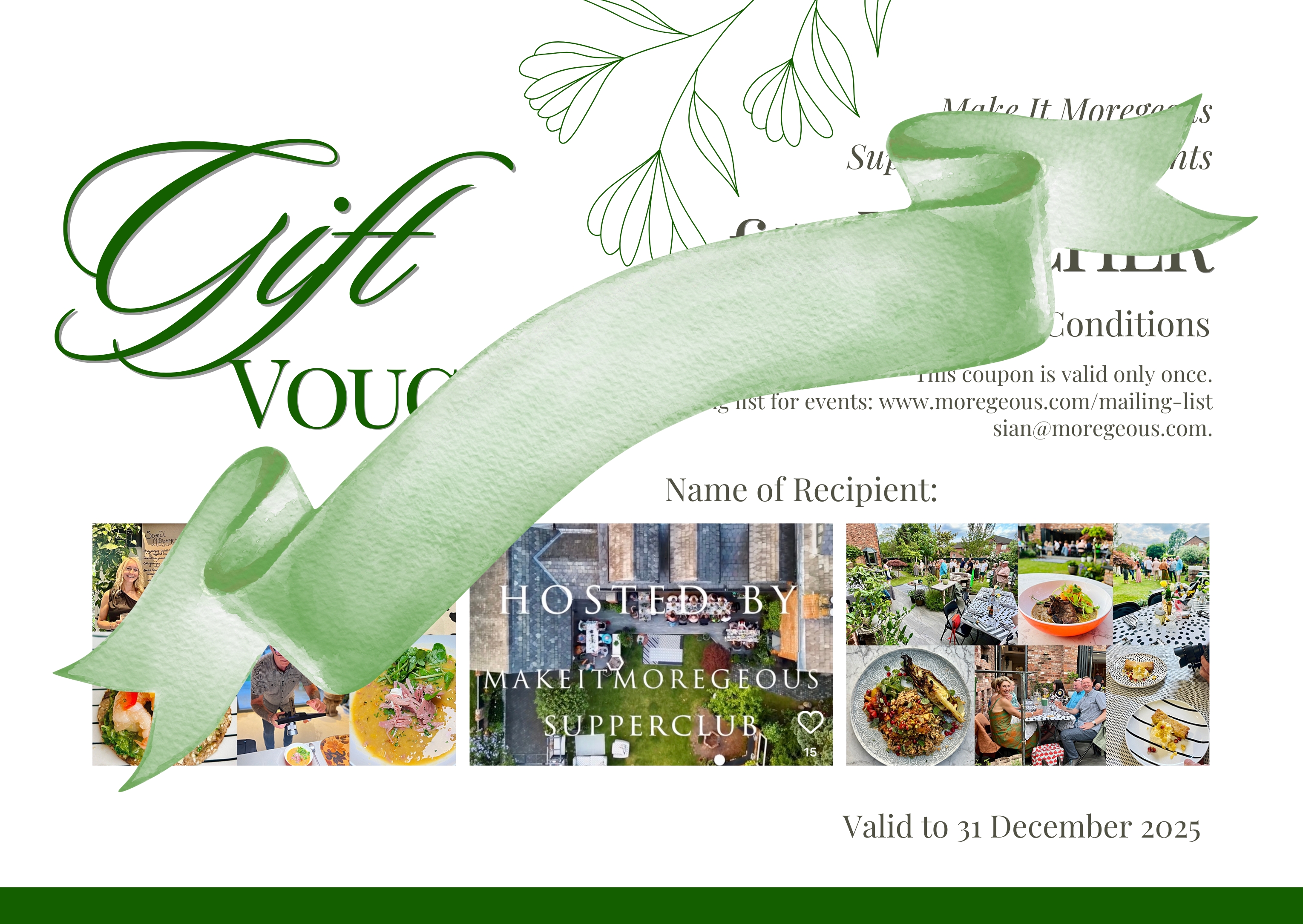 This is a voucher for any Make It Moregeous Supper Club or Craft Day Voucher. They are not time limited so please don’t worry if your recipient takes time to pick a date! Multiple vouchers can be used for one event, eg 4 x £25 would usually seat two guests as a Supper Club.
