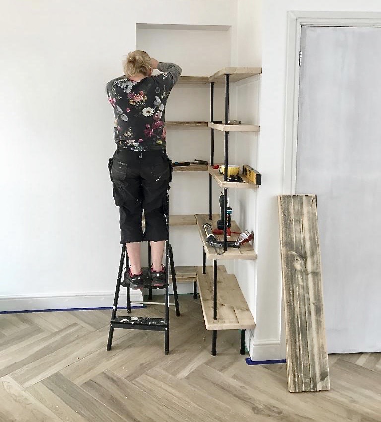 Specification of bifolds, worktops, sink, tap, LED lighting, oak shelving, dining table and wallpaper. Assistance with problems left by builders, such as over large pillar central to the room, design of oak table. DIY lessons with homeowner 😉